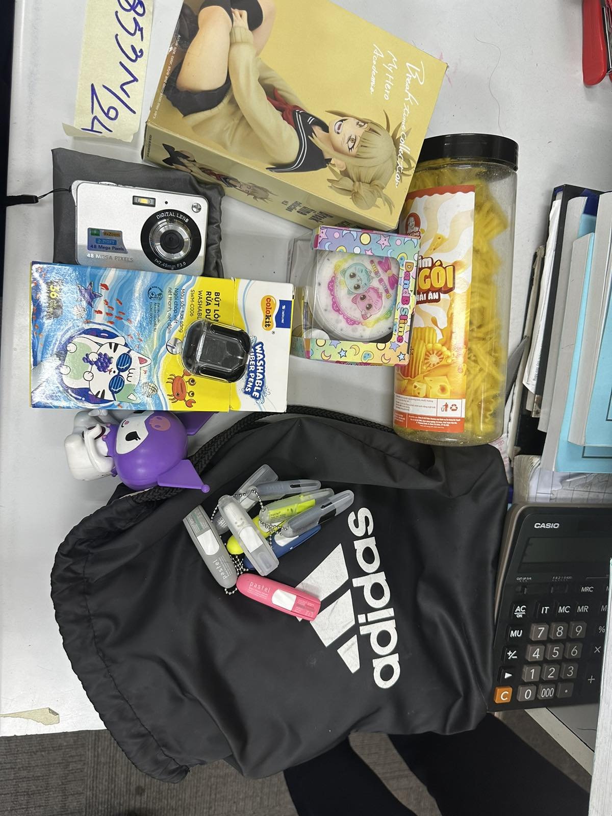 Ngày tiếp nhận: 02/6/2024 Mã hồ sơ: 853N2024 Mô tả: 01 túi vải adidas bên trong gồm có 02 hộp đồ chơi đã qua sử dụng, 01 hộp bút màu đã qua sử dụng, 01 hộp đựng tai nghe đã qua sử dụng, 01 máy ảnh Digital lens đã qua sử dụng, 01 mèo đồ chơi màu tím đã qua sử dụng, 09 đồ dùng nhựa đã qua sử dụng, 01 hộp Bimbim đã qua sử dụng, 01 sạc type C đã qua sử dụng, 01 nón có chữ GUCCI, 01 tập tô màu. |
