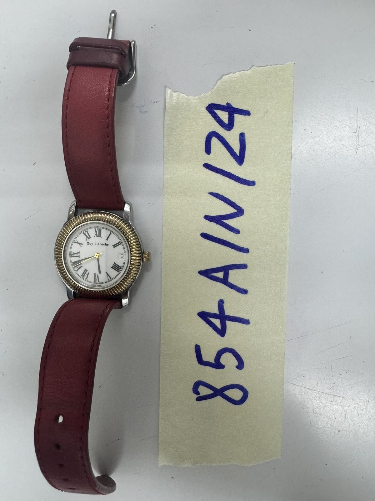 Ngày tiếp nhận: 02/6/2024 Mã hồ sơ: 854N2024A Mô tả: 01 đồng hồ mặt tròn, số la mã, dây da màu bò. Trên mặt có chữ Guy Laroche. |