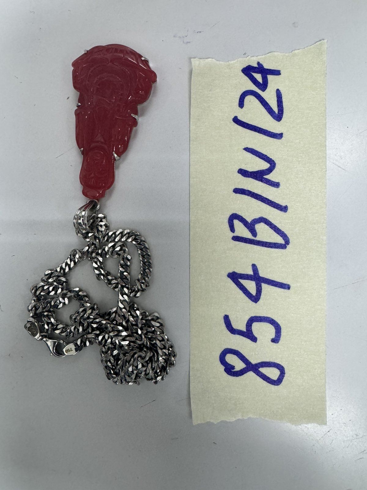 Ngày tiếp nhận: 02/6/2024 Mã hồ sơ: 854N2024B Mô tả: 01 dây chuyền màu bạc có mặt Phật màu đỏ. |