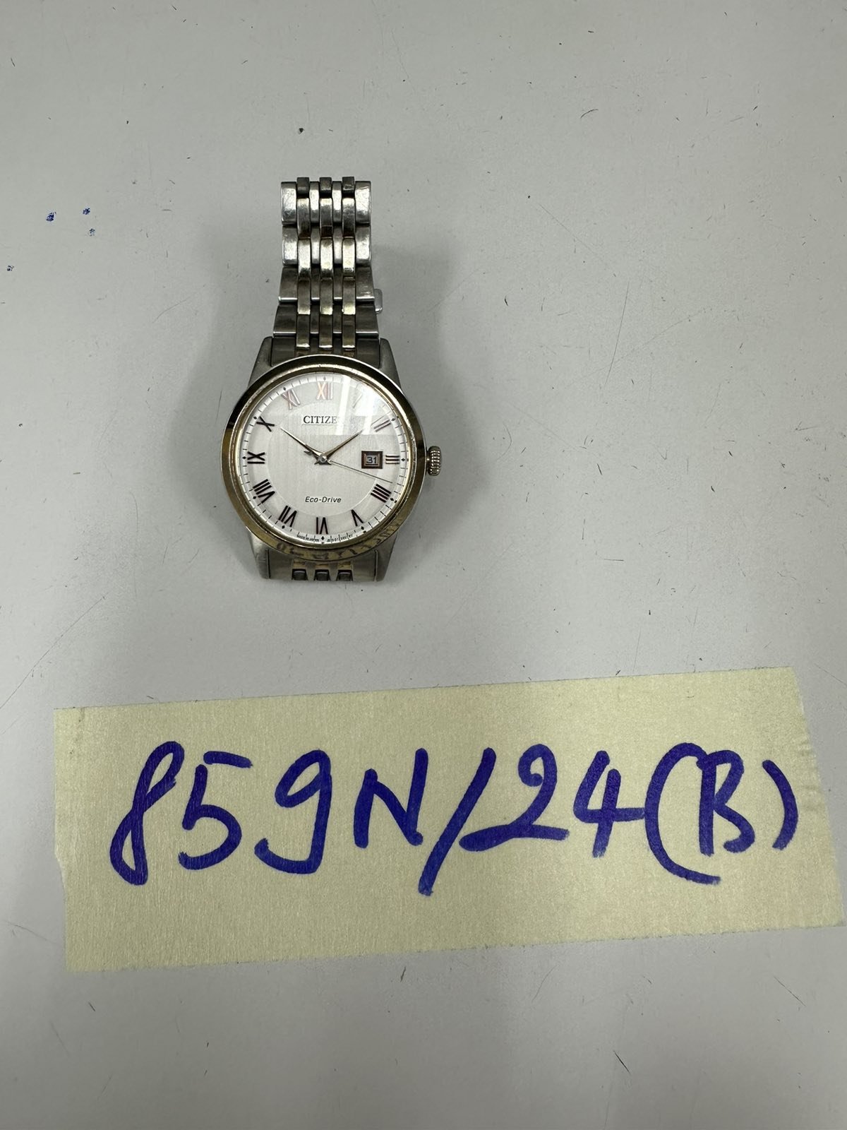 Ngày tiếp nhận: 03/6/2024 Mã hồ sơ: 859N2024B Mô tả: 01 đồng hồ dây kim loại màu bạc, mặt trong có ghi chữ "CITIZEN" . |