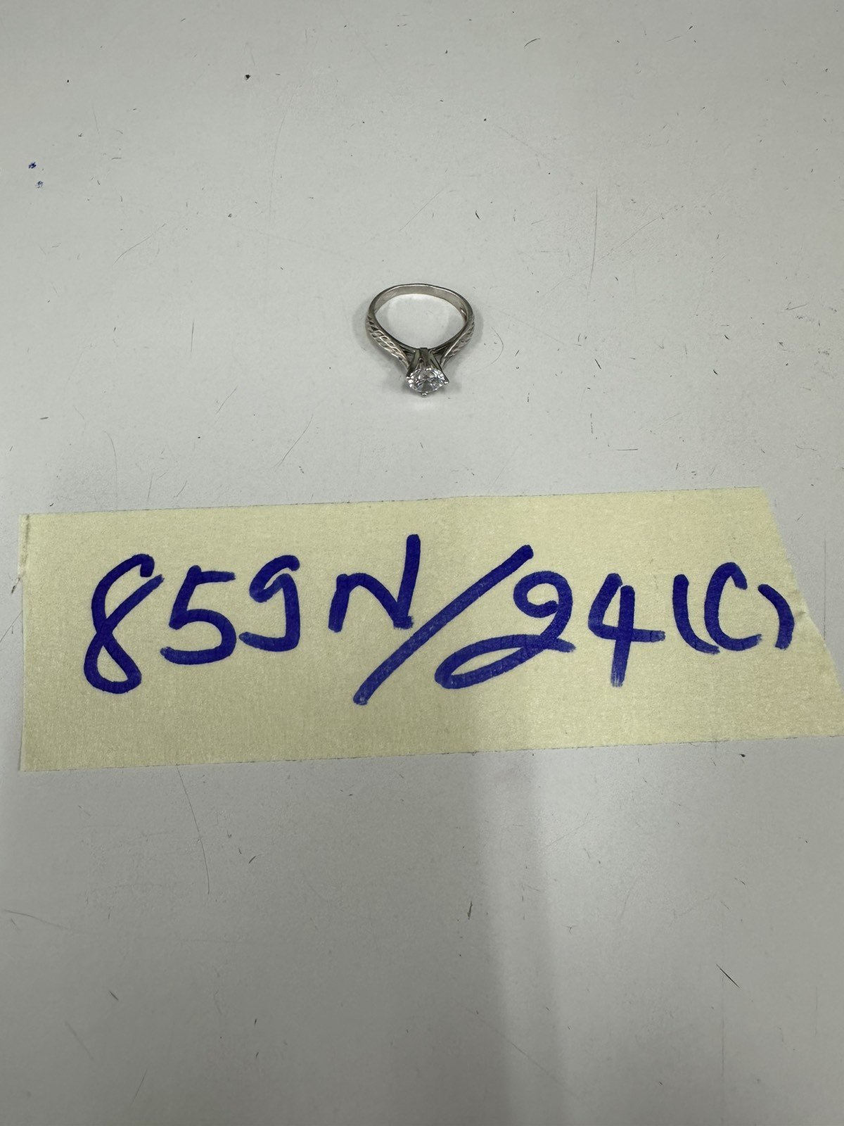 Ngày tiếp nhận: 03/6/2024 Mã hồ sơ: 859N2024C Mô tả: 01 nhẫn nữ kim loại màu bạc có đính đá màu trắng. |