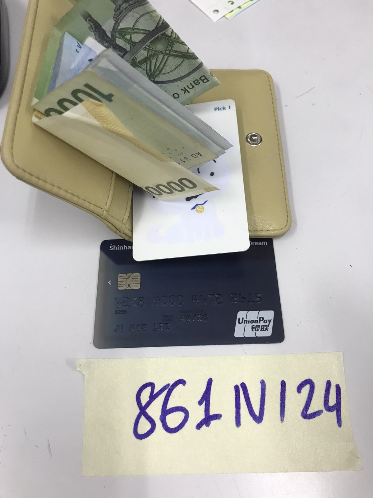 Ngày tiếp nhận: 04/6/2024 Mã hồ sơ: 861N2024 Mô tả: 01 ví da màu vàng bên trong có 64,000 won và 04 thẻ card có chữ Hàn Quốc. |