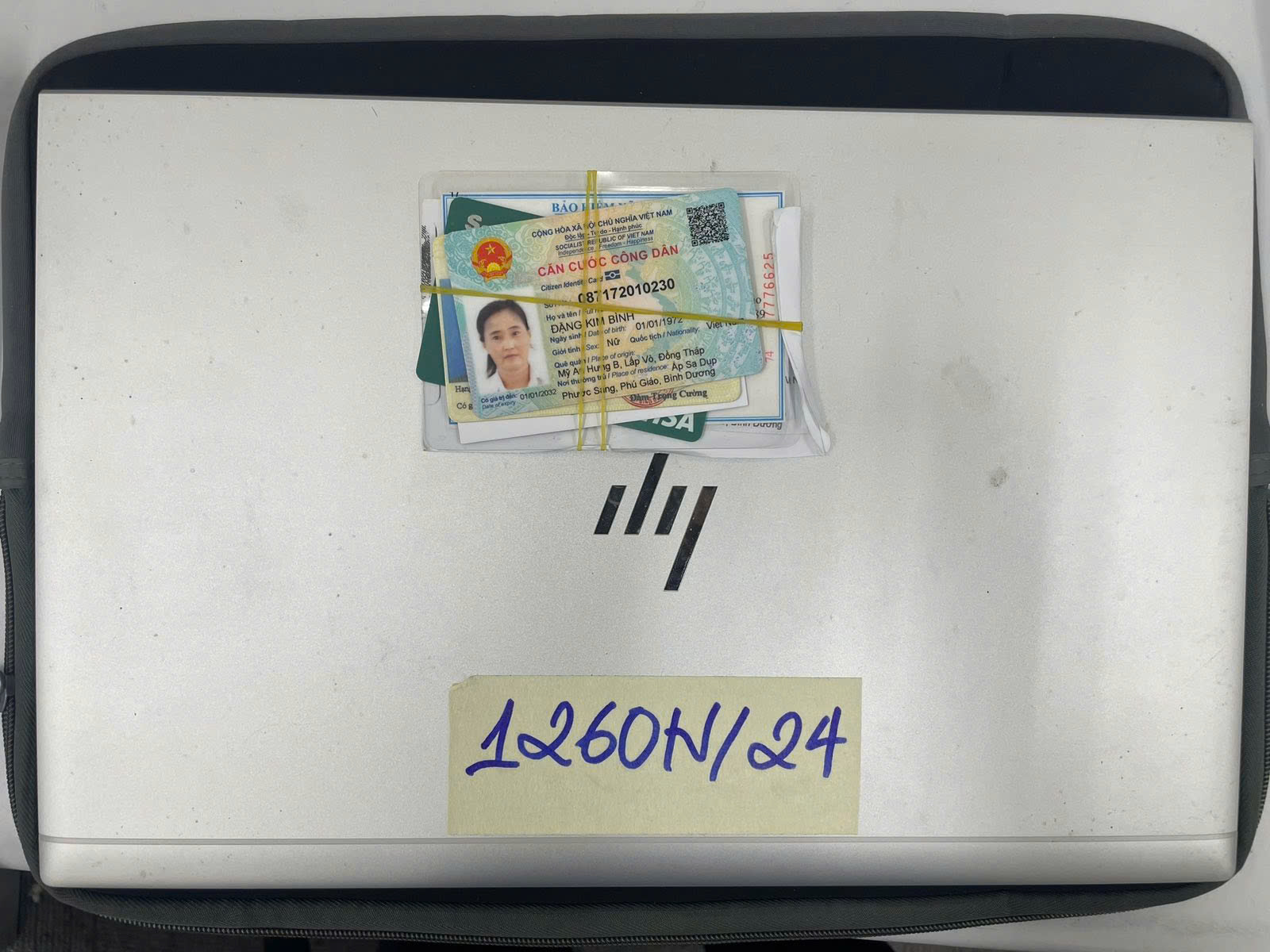 Ngày tiếp nhận: 01/8/2024 Mã hồ sơ: 1260N2024 Mô tả: 01 laptop HP Elitebook 850 G8 màu bạc, serial number 5CG2280BX5 đựng trong túi vải đen, có tên Dr. Minh Dang Doan bên trong túi, 01 thẻ Visa Debit Sacombank mang tên DANG KIM BINH, 01 giấy phép lái xe A1, B2 mang tên ĐẶNG KIM BÌNH, 01 căn cước công dân mang tên ĐẶNG KIM BÌNH, 01 thẻ bảo y tế mang tên LÊ HẢI YẾN. |
