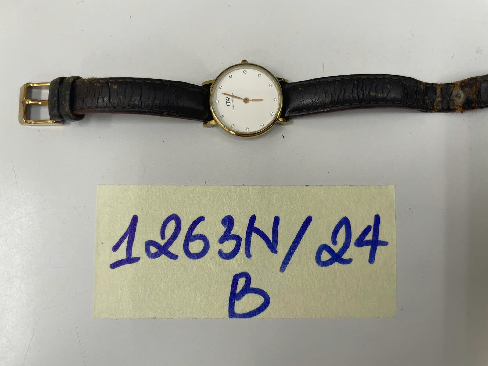 Ngày tiếp nhận: 01/8/2024 Mã hồ sơ: 1263N2024B Mô tả: 01 đồng hồ mặt hình tròn màu trắng viền màu vàng có chữ Daniel Wellington, dây đeo bằng da màu nâu. |