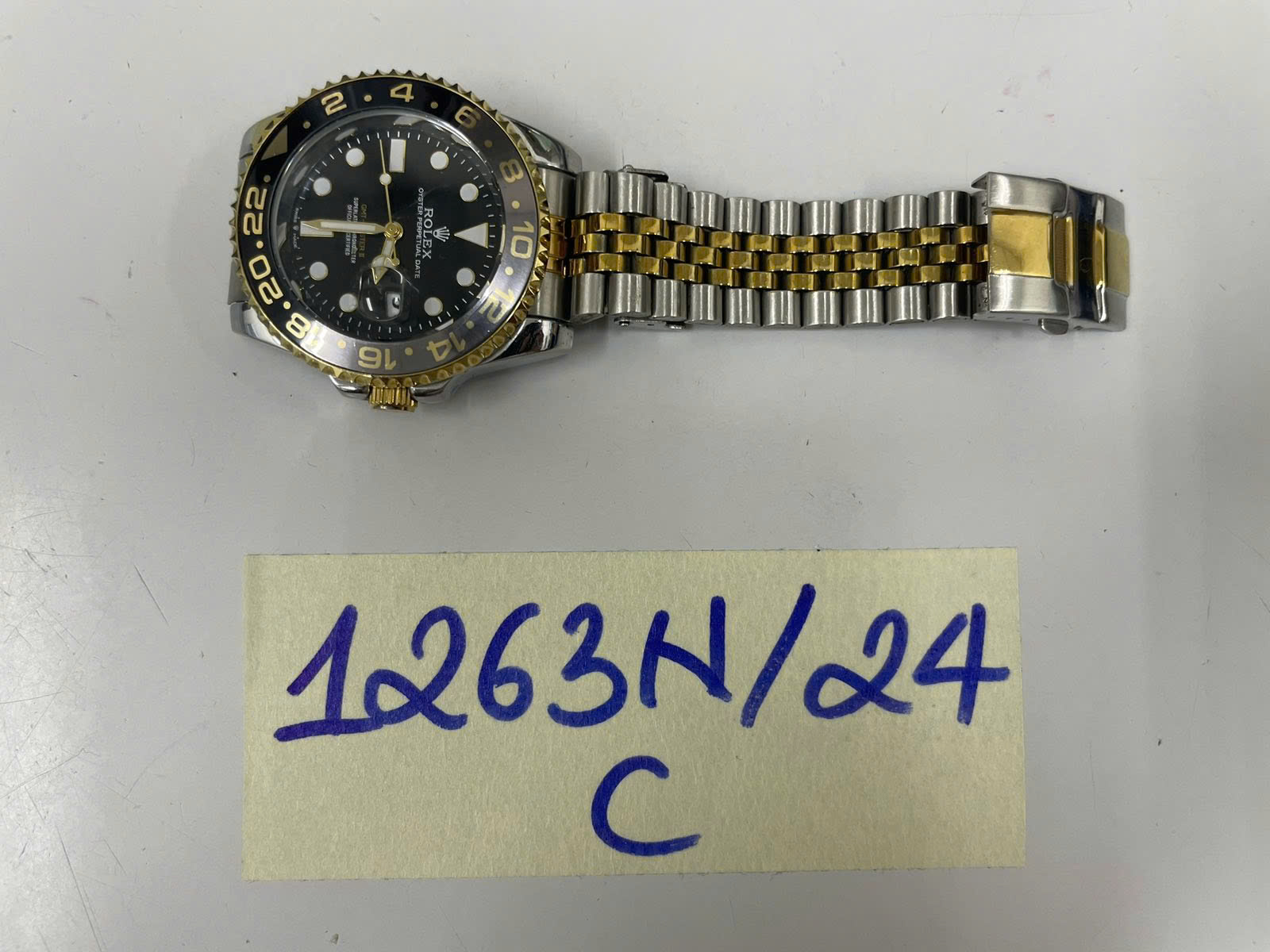 Ngày tiếp nhận: 01/8/2024 Mã hồ sơ: 1263N2024C Mô tả: 01 đồng hồ mặt hình tròn màu đen viền màu vàng có chữ ROLEX dây đeo kim loại màu trắng xen kẽ màu vàng. |