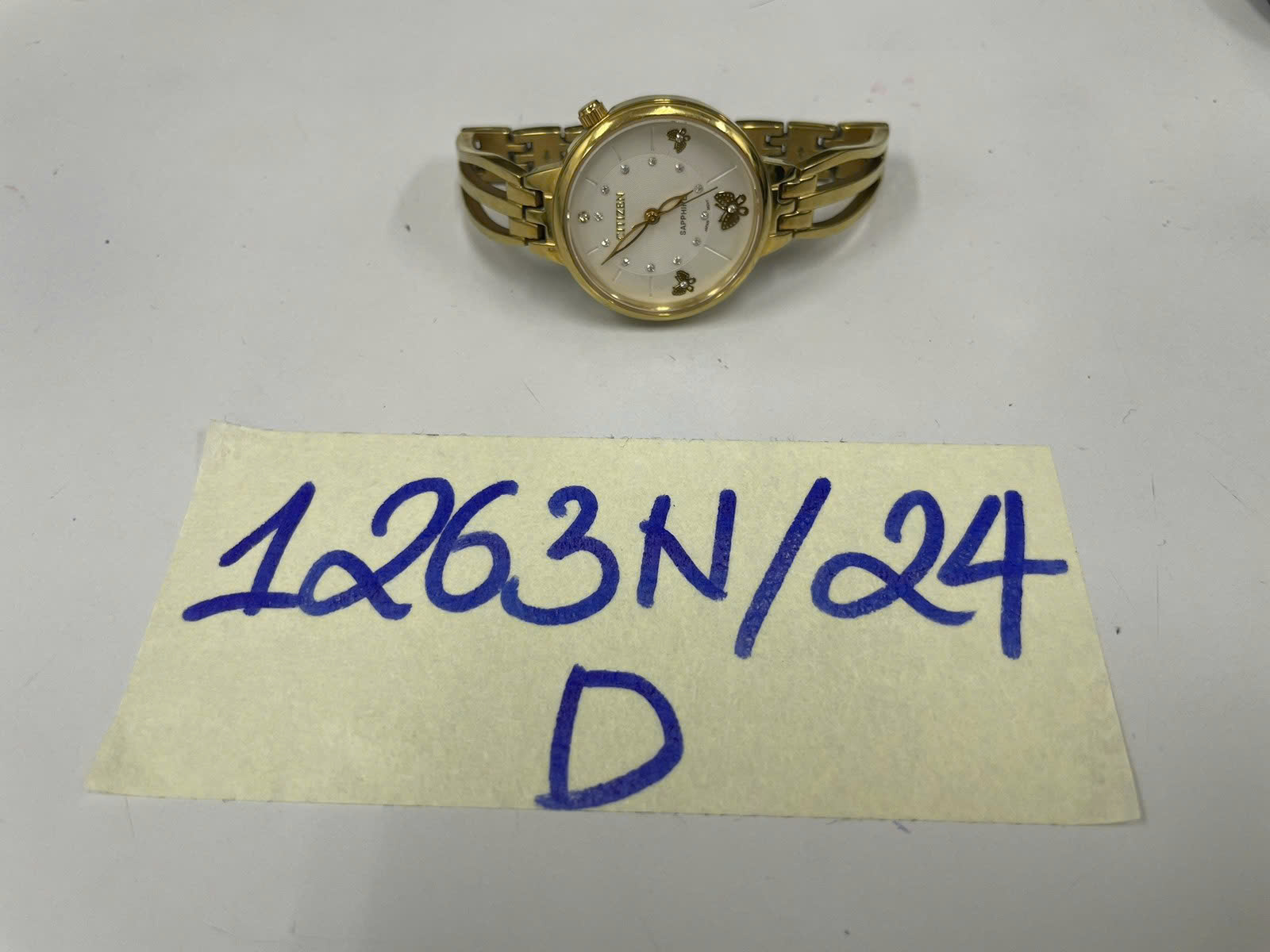 Ngày tiếp nhận: 01/8/2024 Mã hồ sơ: 1263N2024D Mô tả: 01 đồng hồ mặt hình tròn màu trắng viền màu vàng có chữ CITIZEN dây đeo kim loại màu vàng. |