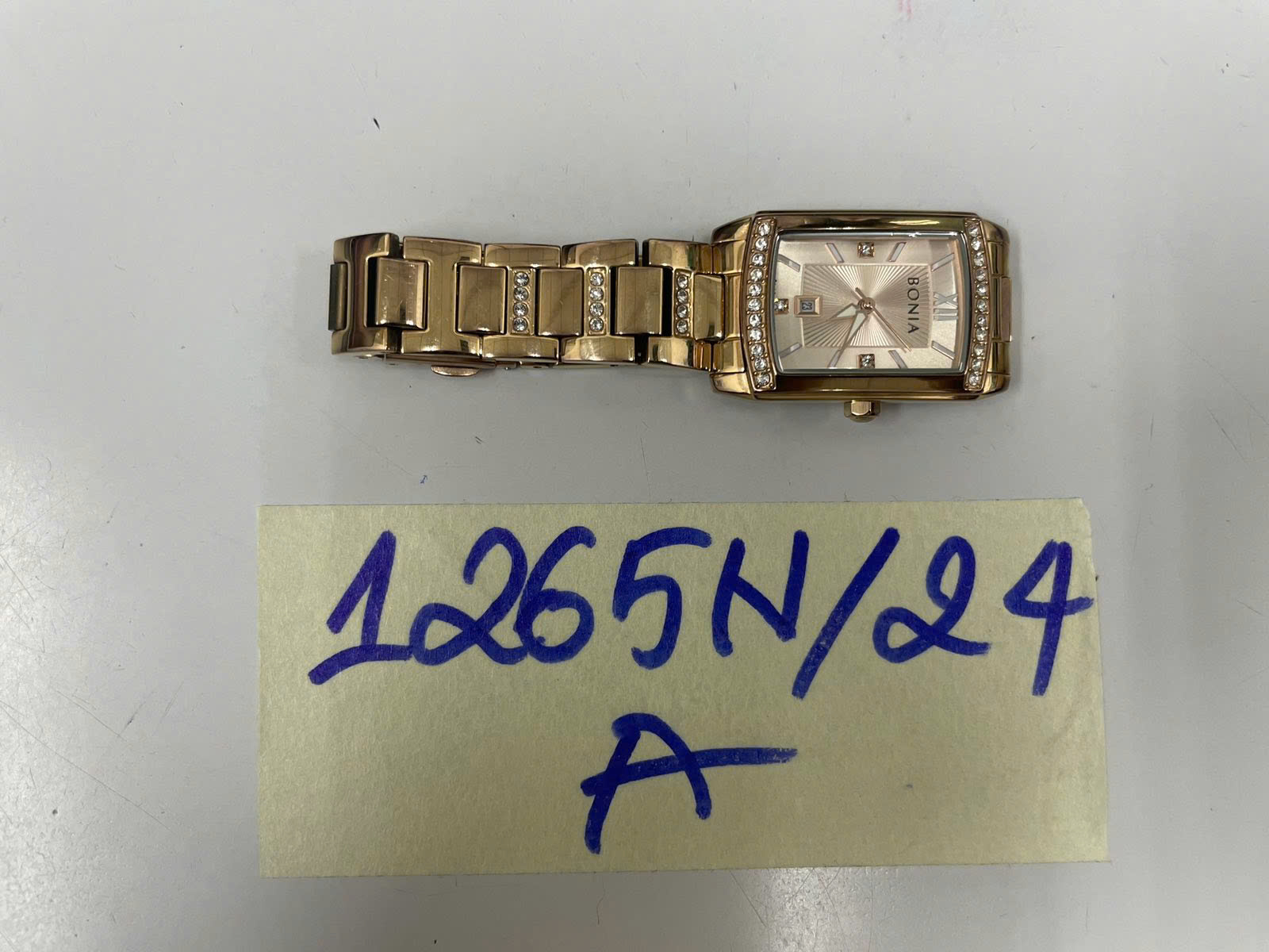 Ngày tiếp nhận: 01/8/2024 Mã hồ sơ: 1265N2024A Mô tả: 01 đồng hồ kim mặt hình chữ nhật, xung quanh mặt đồng hồ có đính hạt màu trắng, dây kim loại màu vàng có chữ BONIA. |
