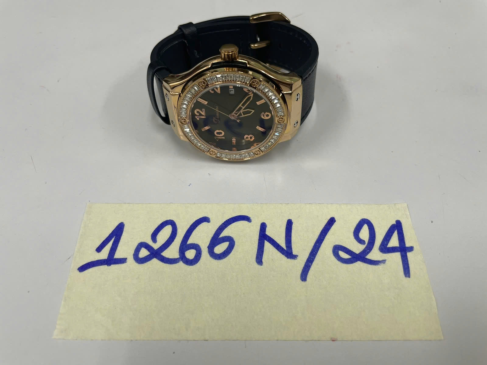 Ngày tiếp nhận: 01/8/2024 Mã hồ sơ: 1266N2024 Mô tả: 01 đồng hồ kim mặt hình tròn màu vàng, xung quanh mặt đồng hồ có đính hạt màu trắng, dây da màu đen có chữ Dinimi. |