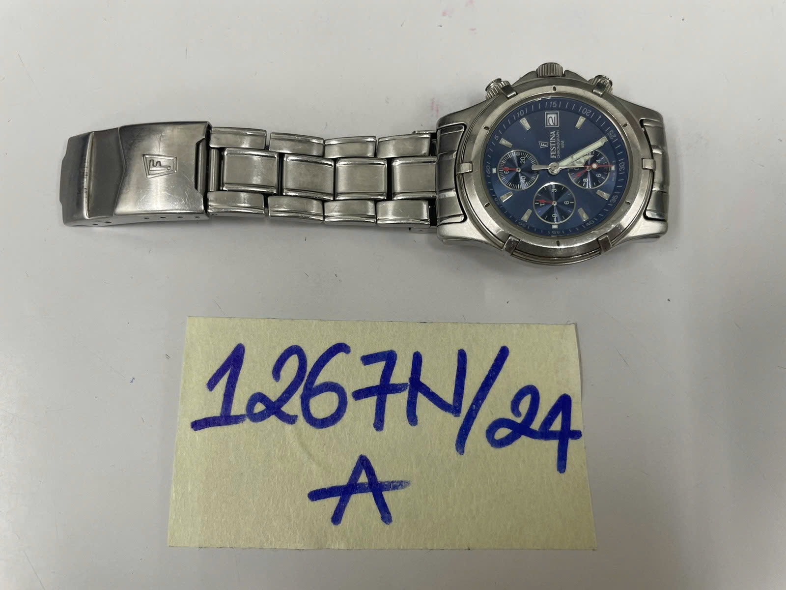 Ngày tiếp nhận: 01/8/2024 Mã hồ sơ: 1267N2024A Mô tả: 01 đồng hồ kim có logo chữ FESSTINA mặt hình tròn viền màu đen, dây kim loại màu bạc. |
