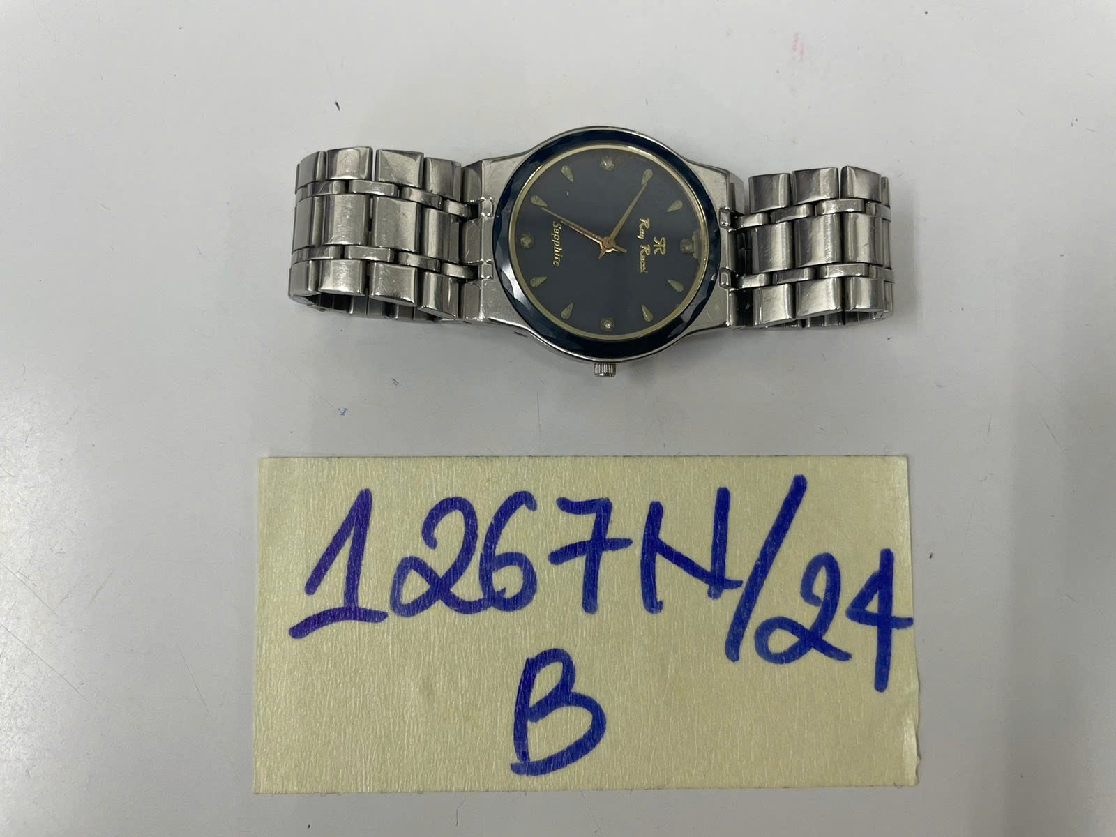 Ngày tiếp nhận: 01/8/2024 Mã hồ sơ: 1267N2024B Mô tả: 01 đồng hồ kim loại có logo chữ RAY RUCCI mặt hình tròn, dây kim loại màu bạc. |
