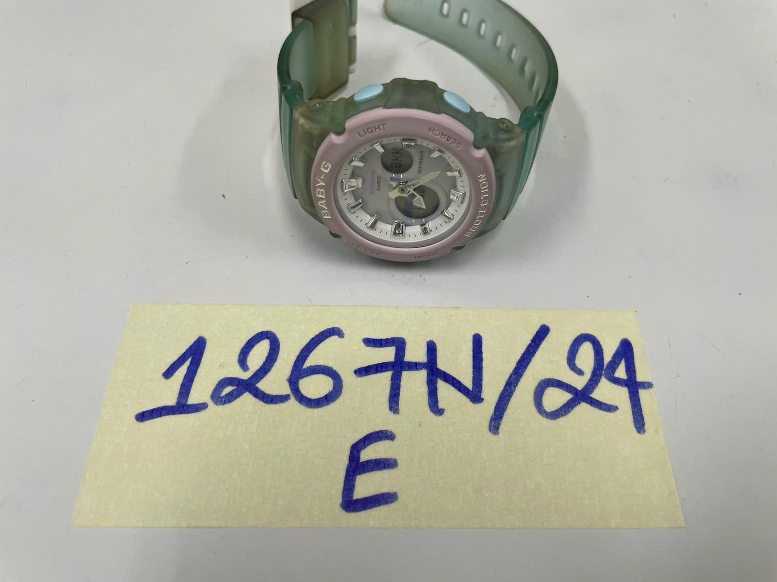 Ngày tiếp nhận: 01/8/2024 Mã hồ sơ: 1267N2024E Mô tả: 01 đồng hồ kim có logo chữ BABY-G mặt hình tròn viền màu hồng dây nhựa màu xanh. |