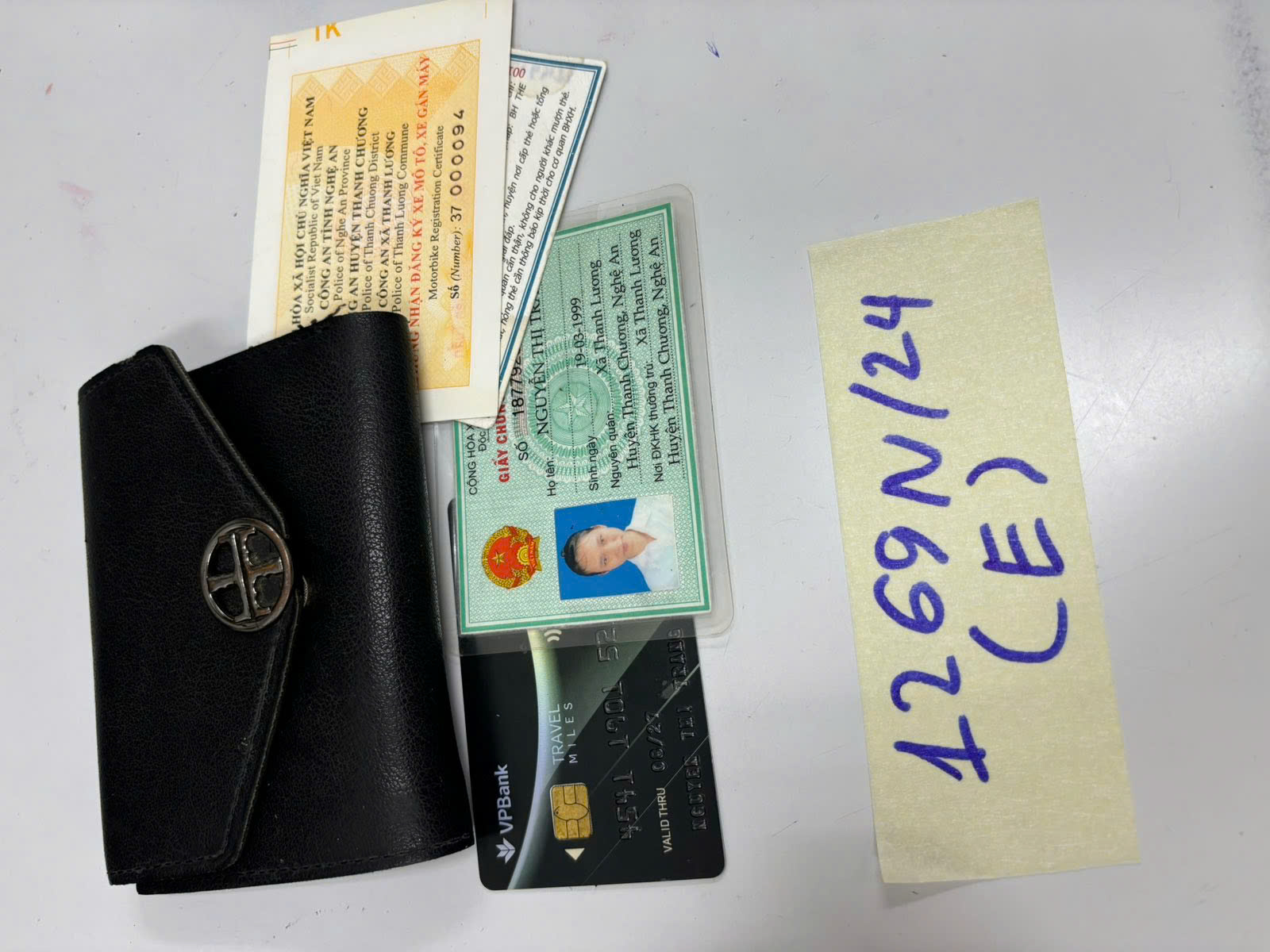 Ngày tiếp nhận: 01/8/2024 Mã hồ sơ: 1269N2024E Mô tả: 01 ví màu đen bên trong có 01 CMND, 01 thẻ ngân hàng, 01 carvet xe, 01 bảo hiểm mang tên NGUYỄN THỊ TRANG. |