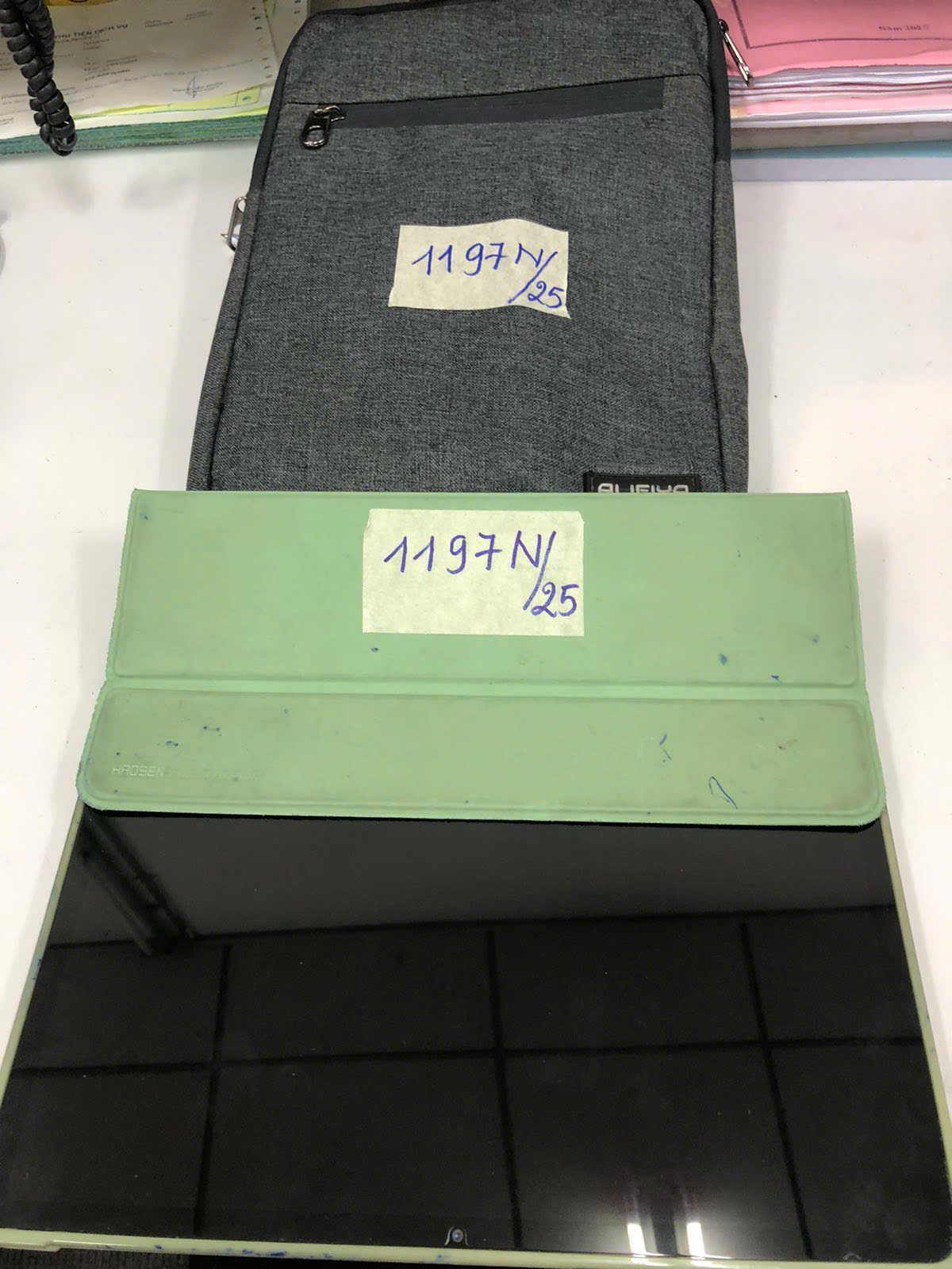 Ngày tiếp nhận: 02/7/2025 Mã hồ sơ: 1197N2025 Mô tả: 01 túi vải bên trong có:01 máy tính bảng SAM SUNG màu hồng,01 ốp lưng màu xanh, 01 bút khóa màn hình đã qua sử dụng. |