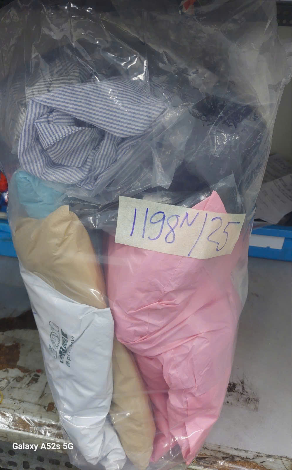 Ngày tiếp nhận: 04/7/2025 Mã hồ sơ: 1214N2025C Mô tả: 01 túi ni lông màu trắng bên trong quần áo cũ. |