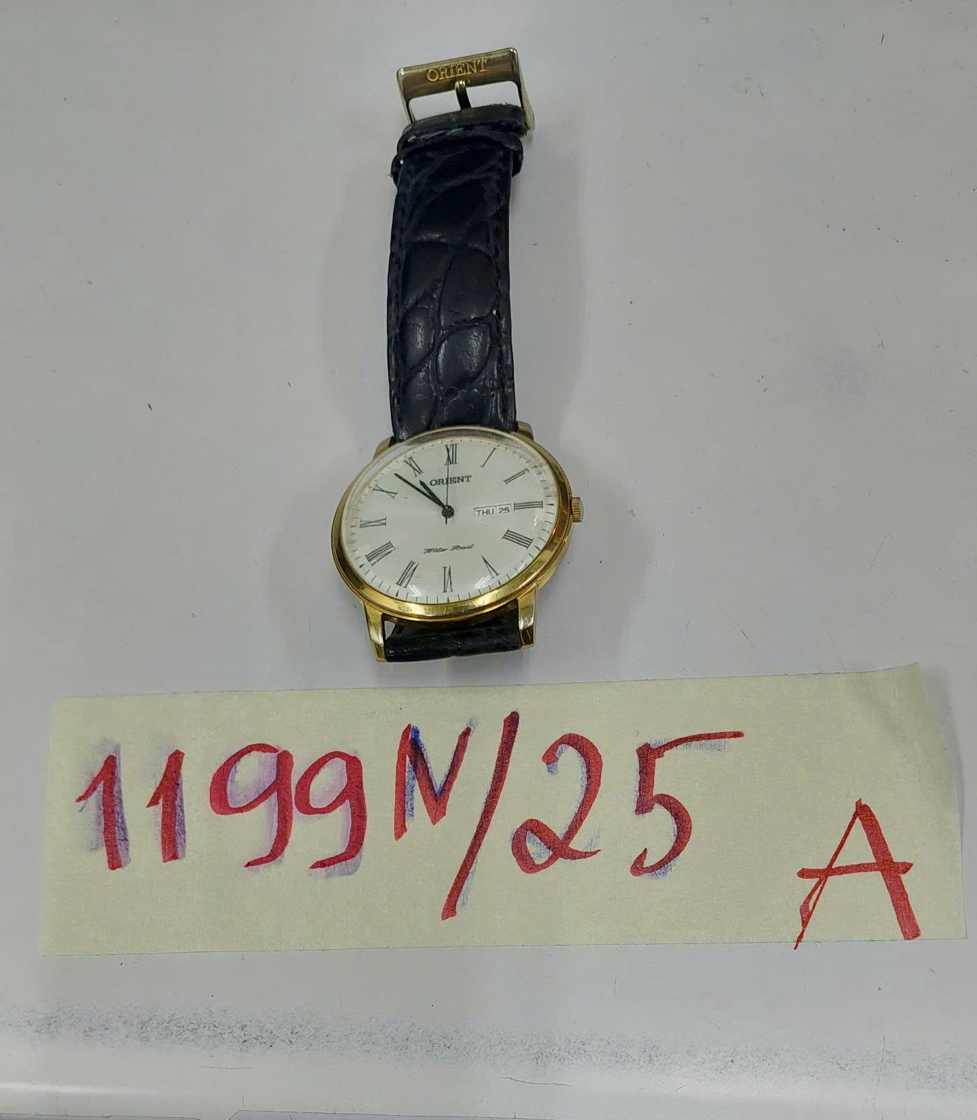 Ngày tiếp nhận: 02/7/2025 Mã hồ sơ: 1199N2025A Mô tả: 01 đồng hồ mặt tròn màu trắng,dây da đen hiệu ORIENT. |