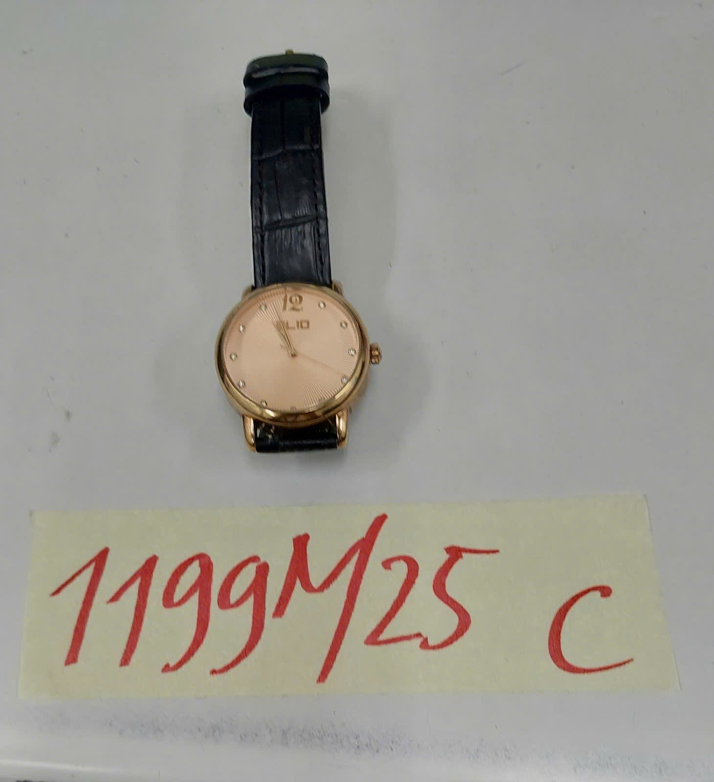 Ngày tiếp nhận: 02/7/2025 Mã hồ sơ: 1199N2025C Mô tả: 01 đồng hồ mặt tròn hồng phấn dây da màu đen hiệu ELIO. |