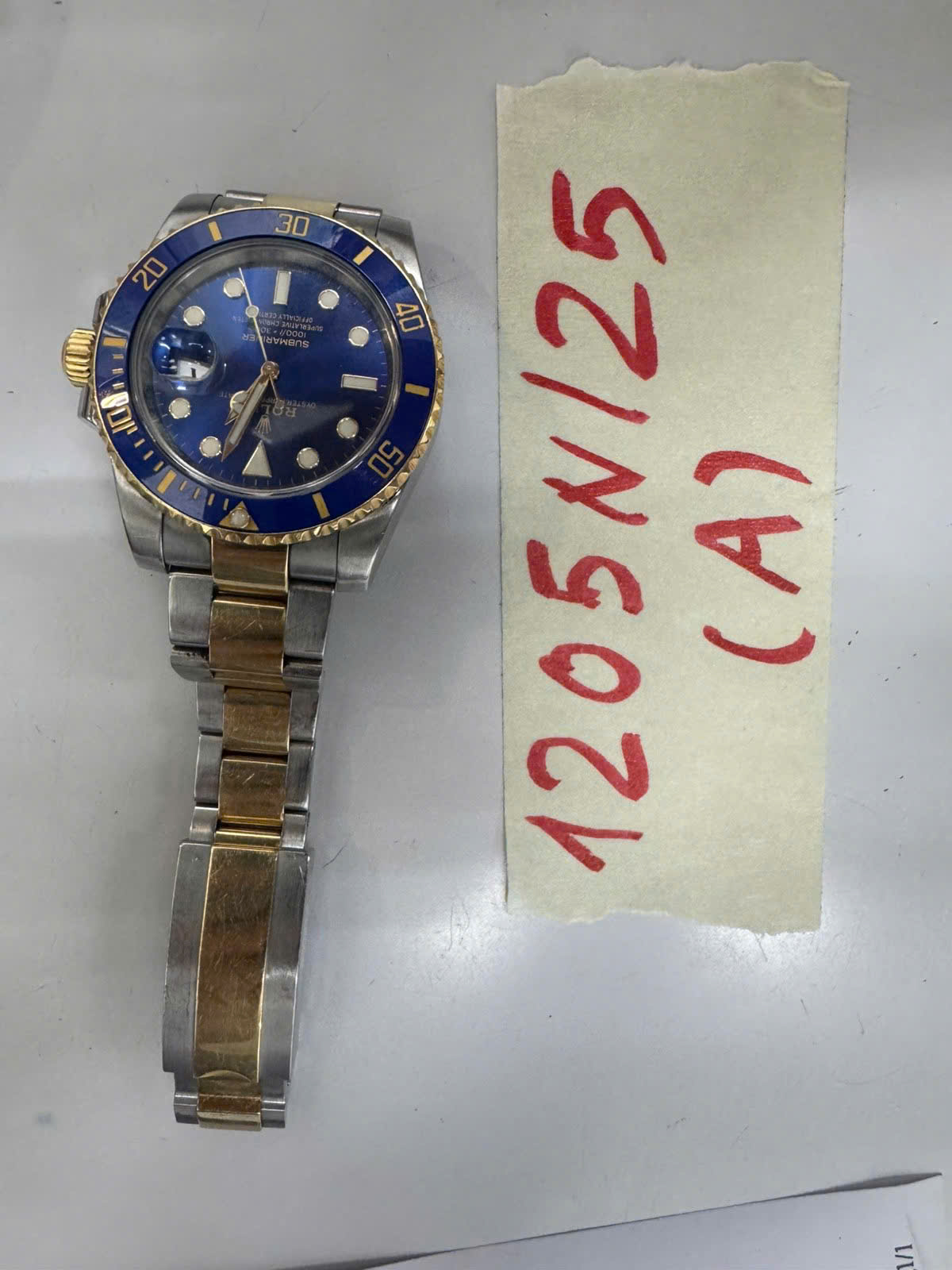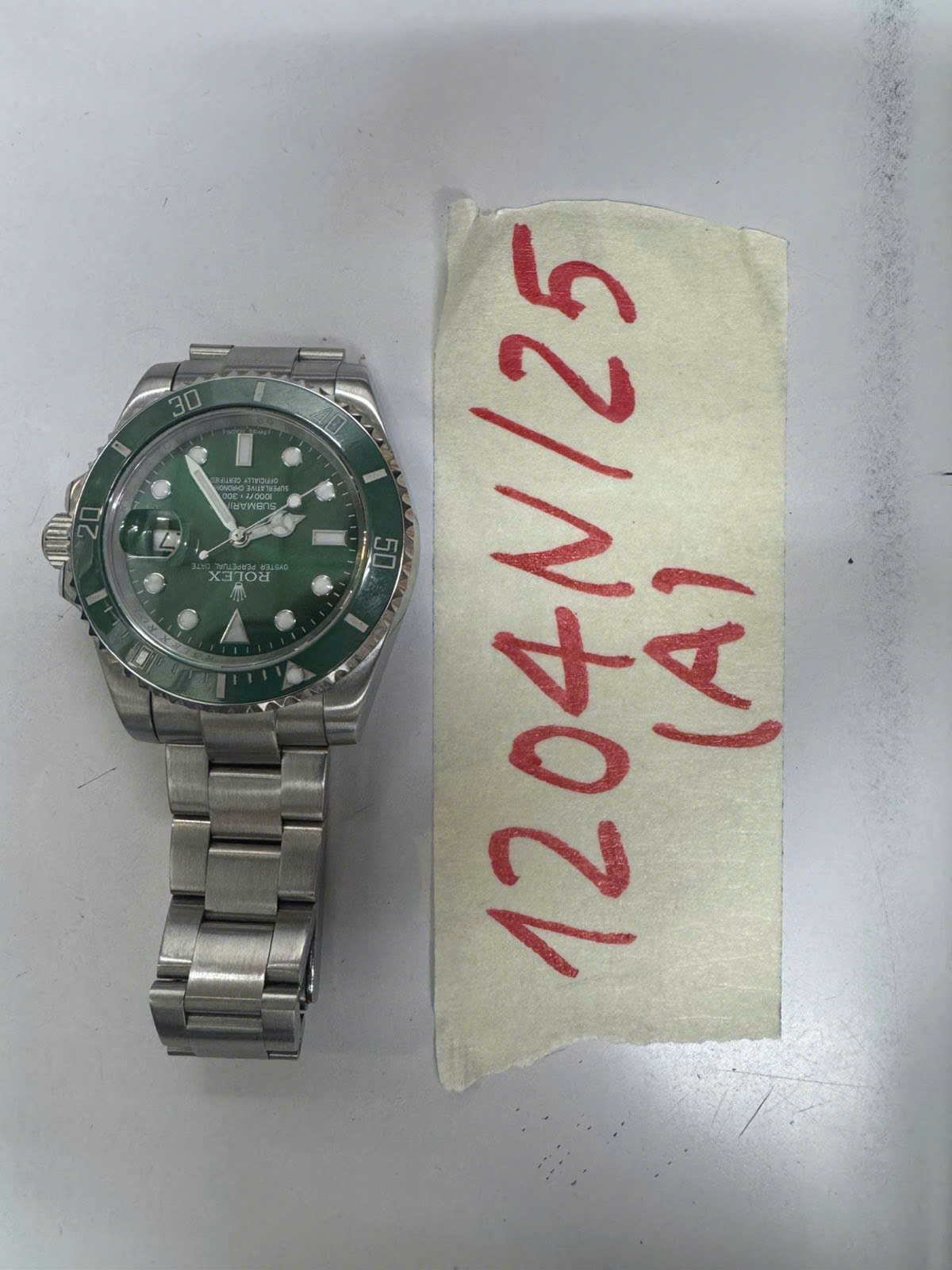 Ngày tiếp nhận: 03/7/2025 Mã hồ sơ: 1204N2025A Mô tả: 01 đồng hồ logo có chữ "rolex" mặt tròn xanh, kim loại bạc. |
