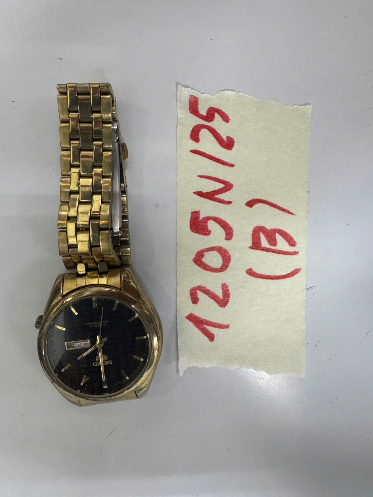 Ngày tiếp nhận: 03/7/2025 Mã hồ sơ: 1205N2025B Mô tả: 01 đồng hồ kim loại màu vàng đổng có chữ seiko 5. |
