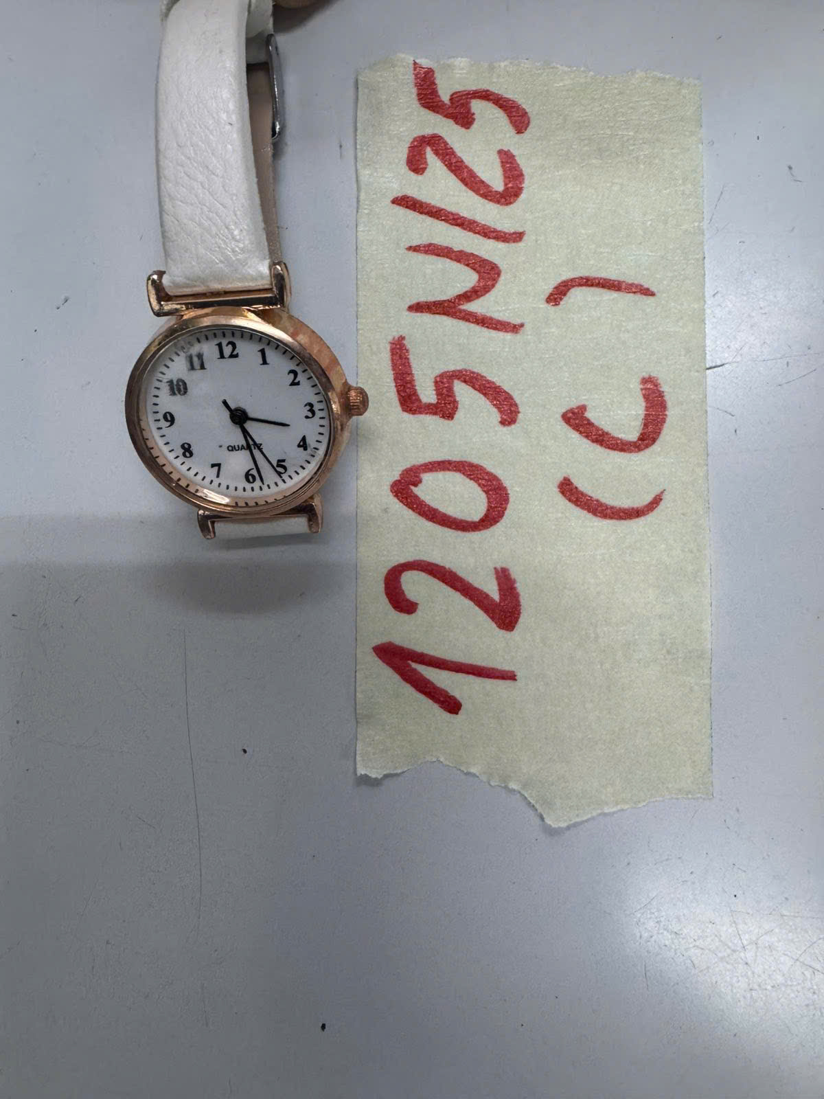 Ngày tiếp nhận: 03/7/2025 Mã hồ sơ: 1205N2025C Mô tả: 01 đồng hồ hình tròn kim loại màu vàng đồng, dây da màu trắng"quatar". |