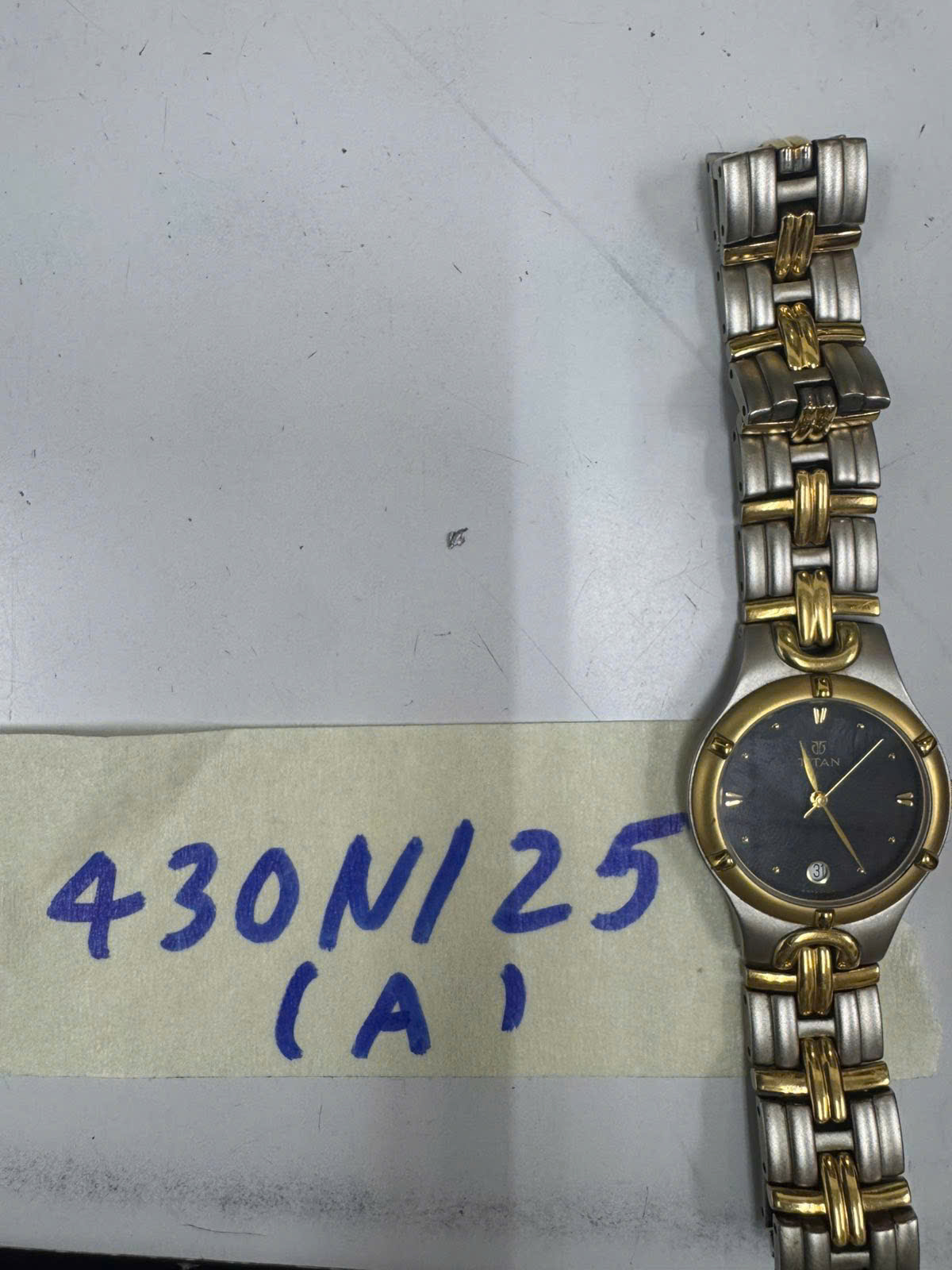 Ngày tiếp nhận: 03/03/2025 Mã hồ sơ: 430N2025A Mô tả: 01 đồng hồ mặt tròn màu đen chữ TITAN, dây kim loại màu trắng. |