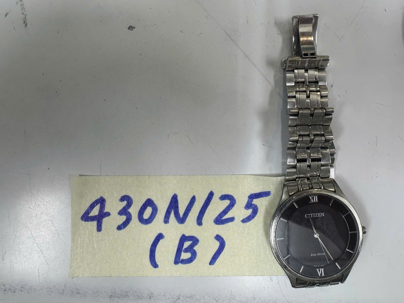 Ngày tiếp nhận: 03/03/2025 Mã hồ sơ: 430N2025B Mô tả: 01 đồng hồ mặt tròn màu đen chữ CITIZEN, dây kim loại trắng vàng. |