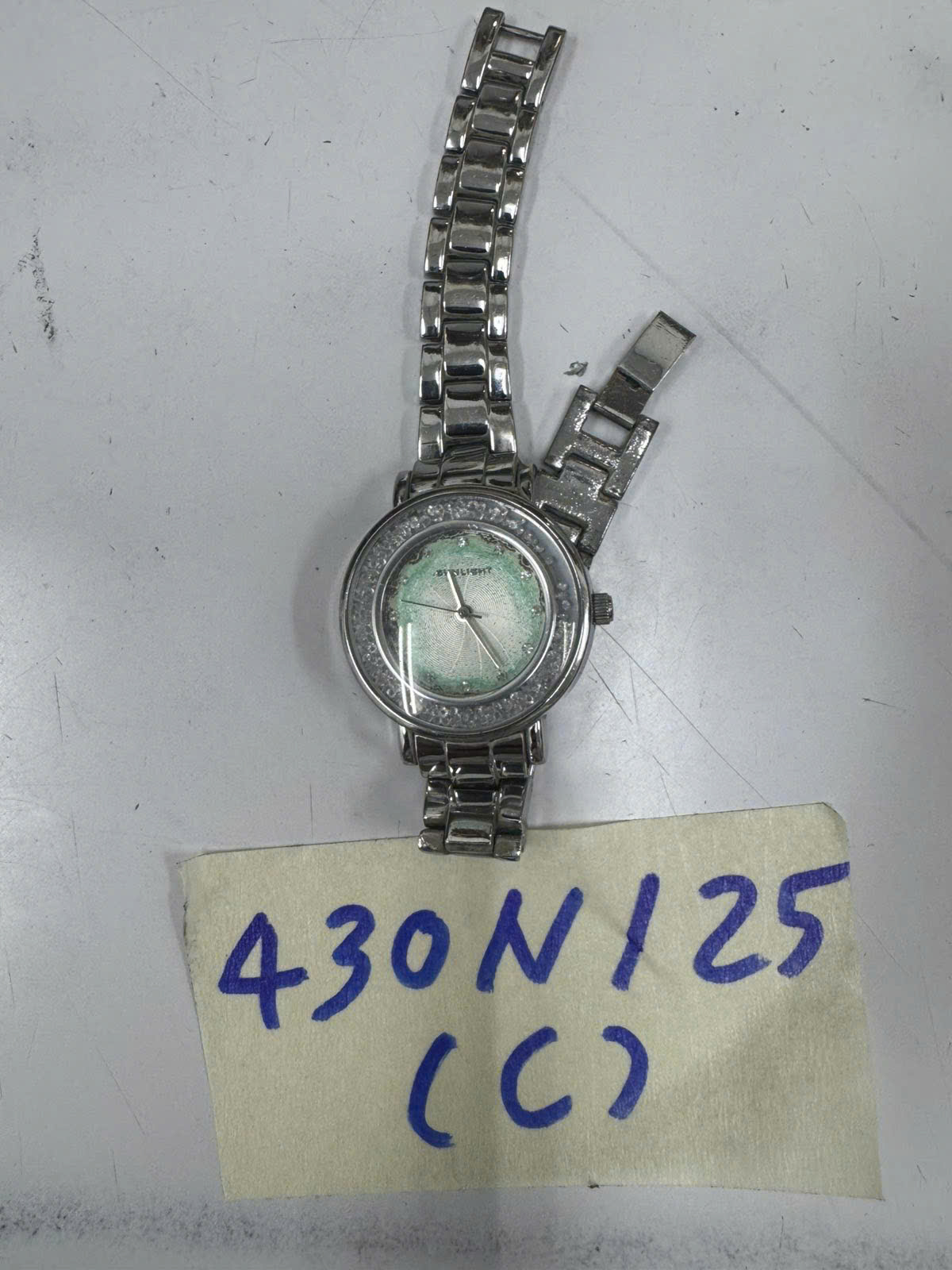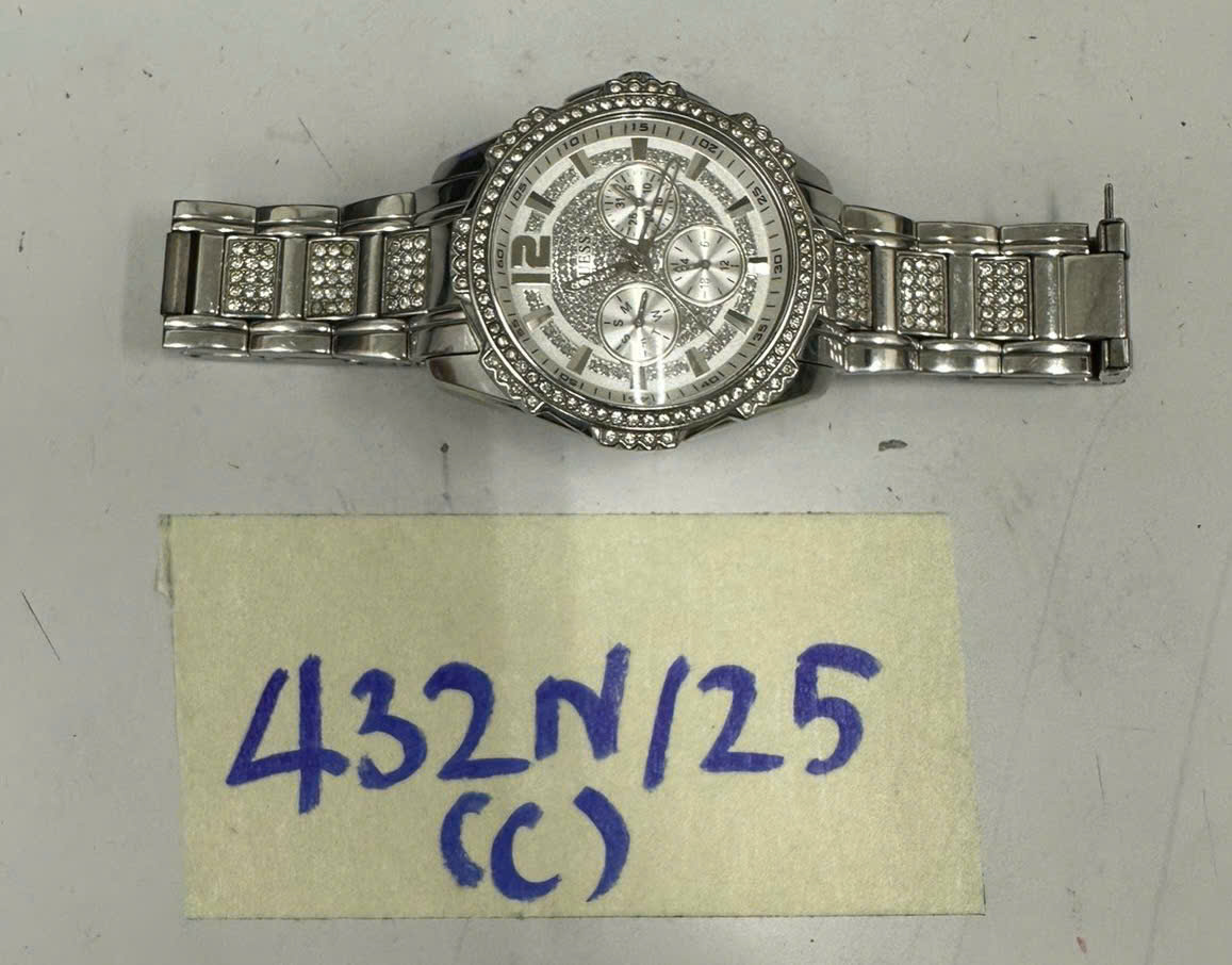 Ngày tiếp nhận: 04/03/2025 Mã hồ sơ: 432N2025C Mô tả: 01 đồng hồ dây kim loại màu trắng có đính hạt có chữ Guess. |