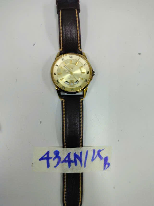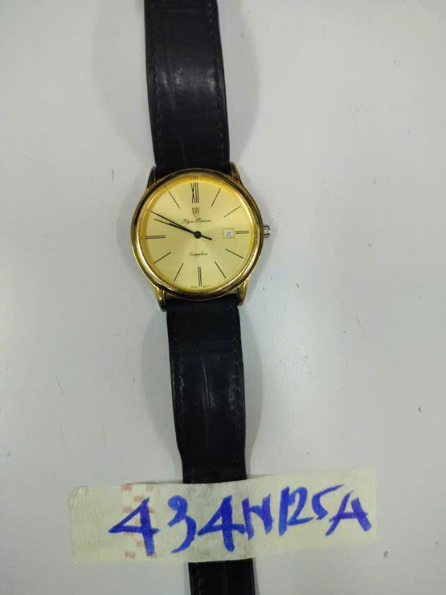 Ngày tiếp nhận: 05/03/2025 Mã hồ sơ: 434N2025A Mô tả: 01 đồng hồ khung kim loại màu vàng dây da màu đen có chữ Olym Pianus. |
