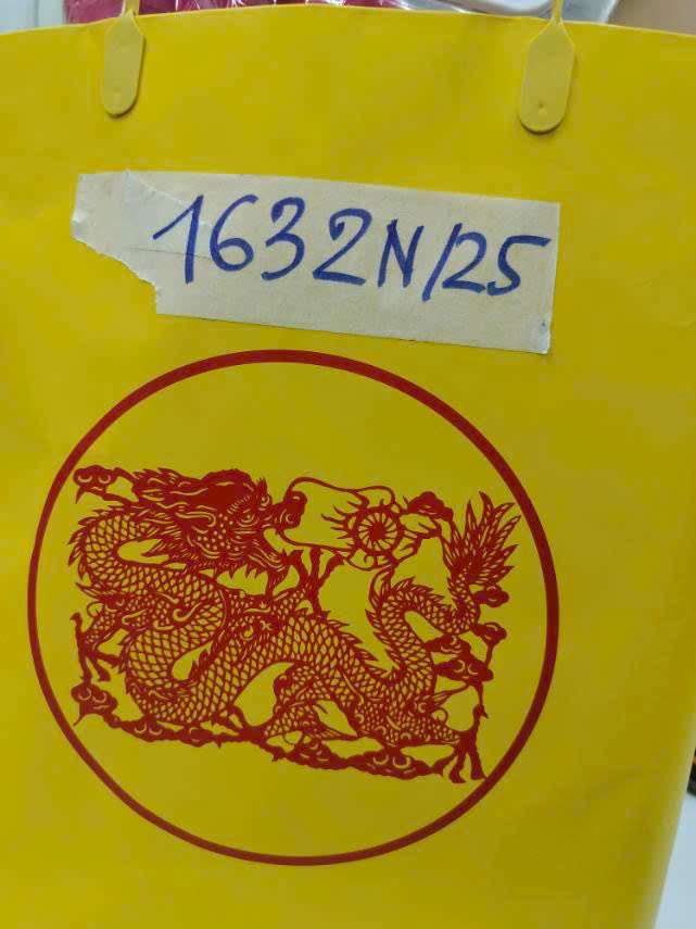 Ngày tiếp nhận: 05/9/2025 Mã hồ sơ: 1632N2025 Mô tả: 01 túi giấy màu vàng 01 chai rượu có chữ Trung Quốc. |
