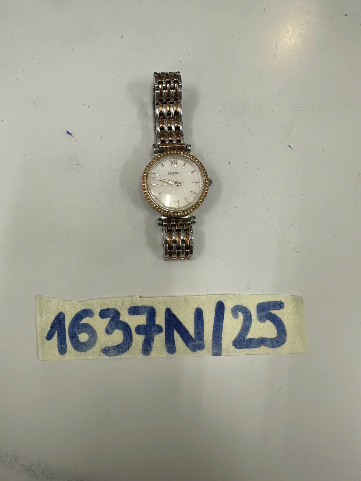 Ngày tiếp nhận: 06/9/2025 Mã hồ sơ: 1637N2025 Mô tả: 01 đồng hồ "FOSSIL" dây kim loại màu bạc sọc vàng, mặt đồng hồ bị xước. |
