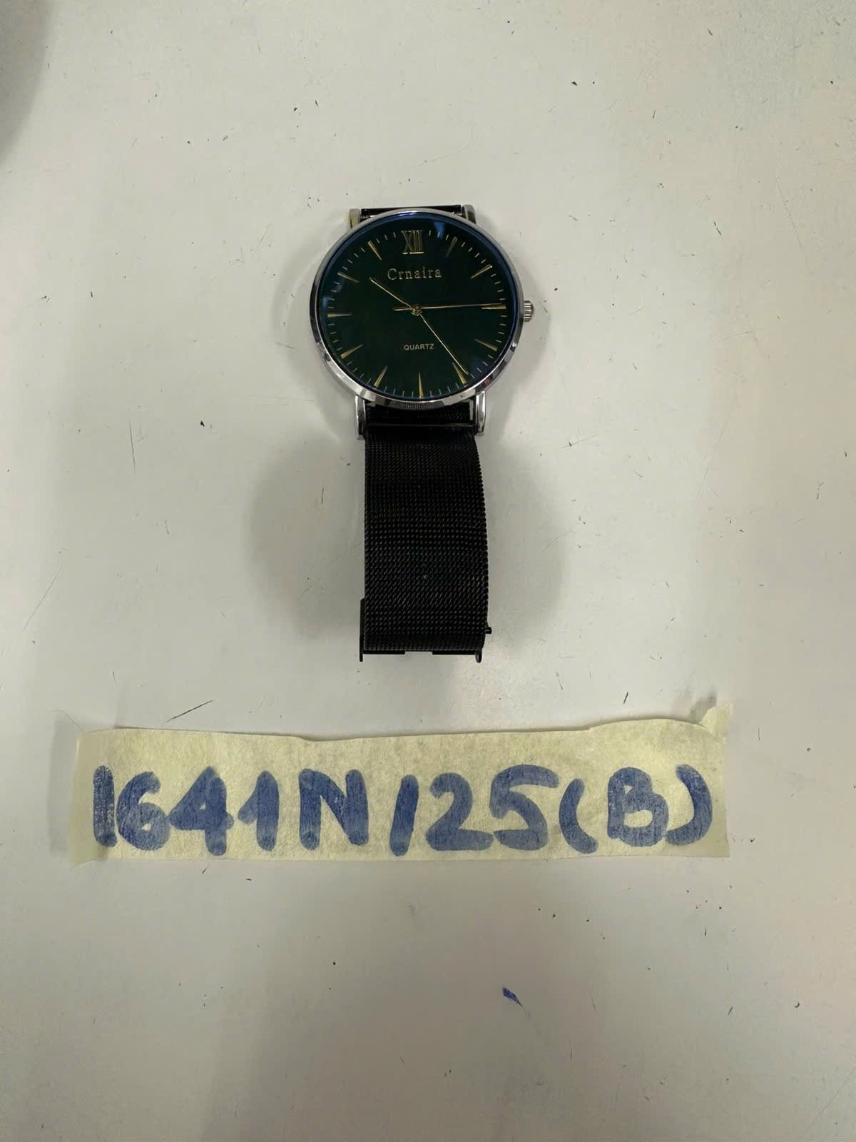 Ngày tiếp nhận: 06/9/2025 Mã hồ sơ: 1641N2025B Mô tả: 01 đồng hồ mặt tròn có chữ "CRNAIRA", dây đeo bằng kim loại màu đen. |