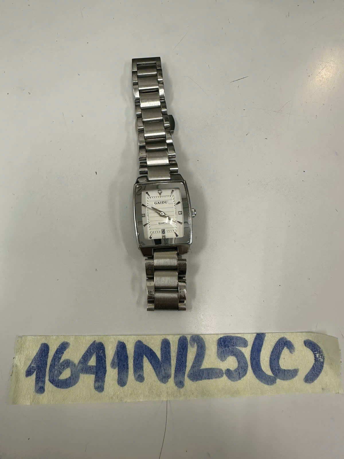 Ngày tiếp nhận: 06/9/2025 Mã hồ sơ: 1641N2025C Mô tả: 01 đồng hồ mặt chữ nhật có chữ "GAIDU", dây đeo bằng kim loại màu trắng. |