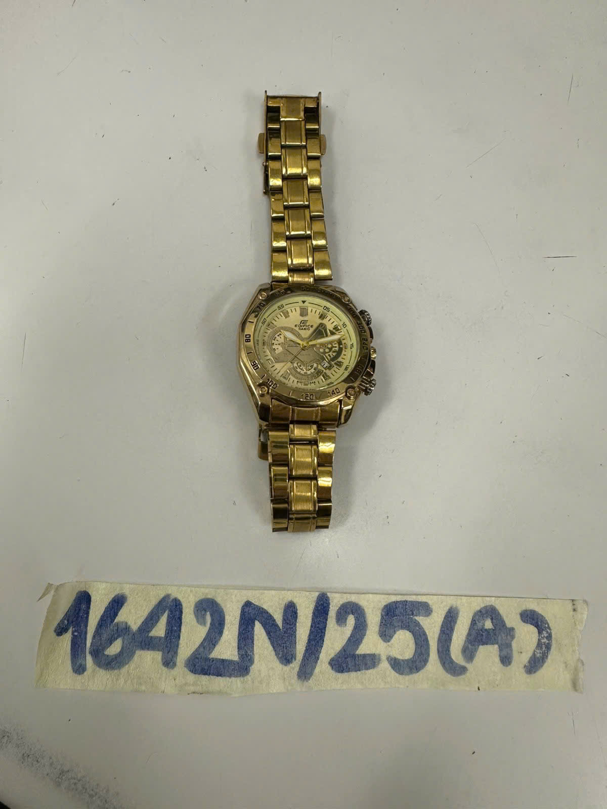 Ngày tiếp nhận: 06/9/2025 Mã hồ sơ: 1642N2025A Mô tả: 01 đồng hồ đeo tay bằng kim loại màu vàng, mặt hình tròn có logo chữ "CASIO EDIFICE". |