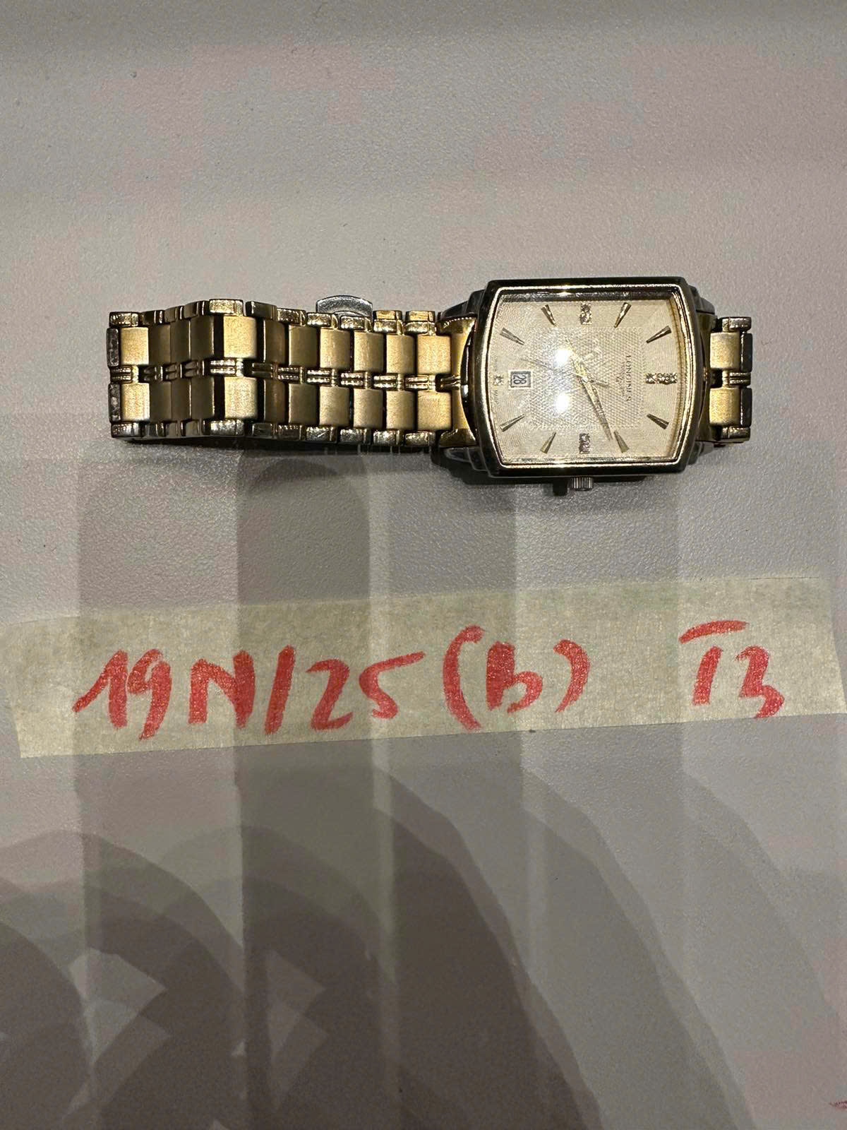 Ngày tiếp nhận: 04/9/2025 Mã hồ sơ: 19N2025B Mô tả: 01 đồng hồ màu vàng mặt vuông hiệu Longines. |
