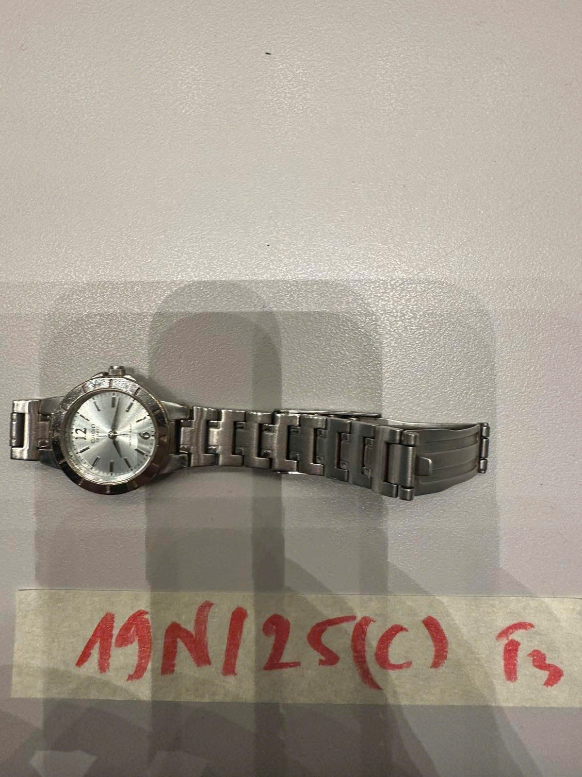 Ngày tiếp nhận: 04/9/2025 Mã hồ sơ: 19N2025C Mô tả: 01 đồng hồ kim loại mặt tròn mặt trắng bạc có chữ Casio. |