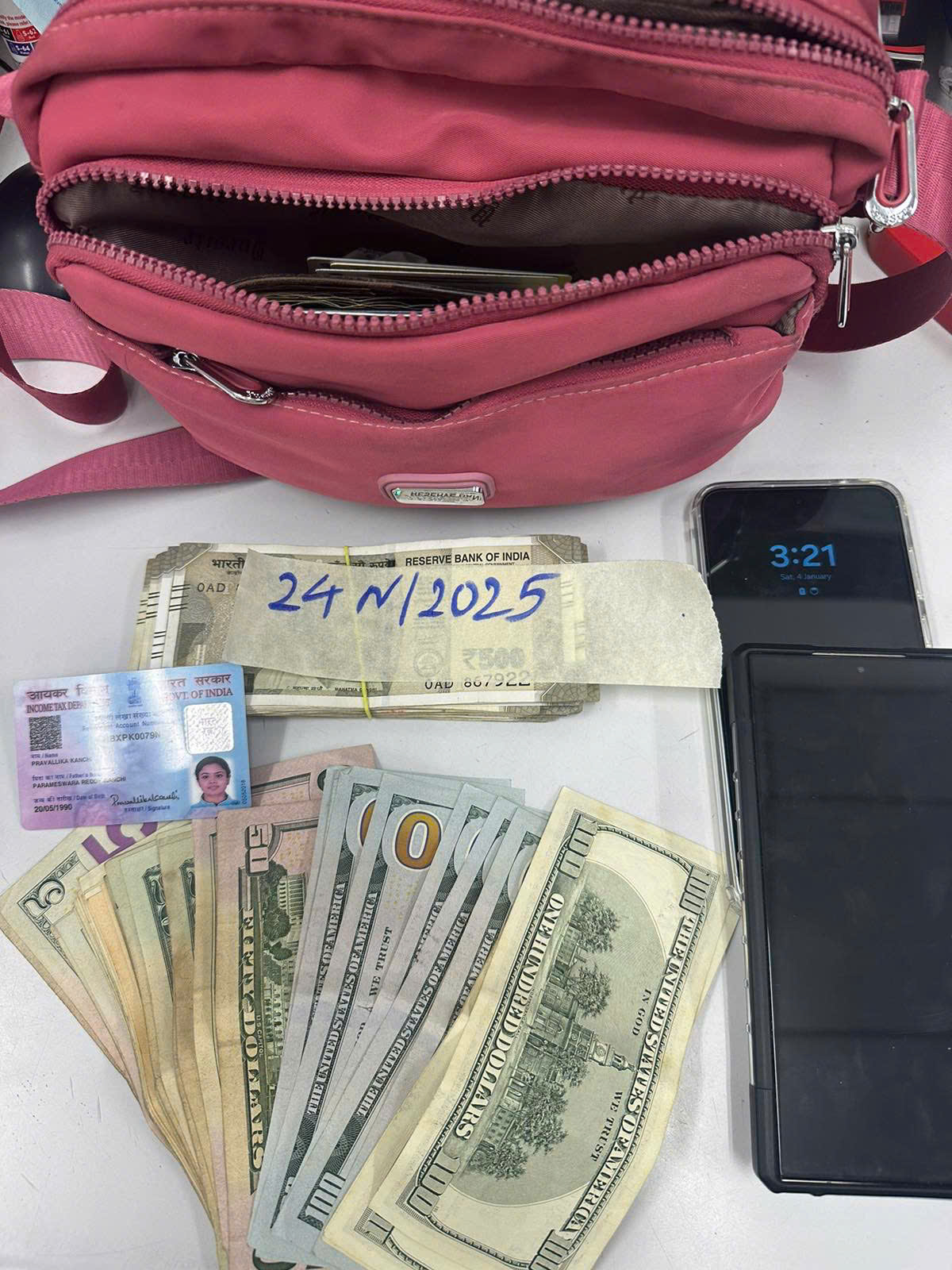Ngày tiếp nhận: 04/01/2025 Mã hồ sơ: 24N2025 Mô tả: 01 túi đeo màu đỏ bên trong có: 02 tờ mệnh giá 100USD, 02 tờ 50USD, 09 tờ mệnh giá 20USD, 03 tờ mệnh giá 10USD, 43USD tiền đô lẻ và giấy tờ tùy thân KANCHI PRAVALIKA; 01 ví màu nâu có 81 tờ tiền Ấn 500 Rupee, 01 tờ 200 Rupee, 07 tờ 100 Rupee, 05 tờ 50 Rupee, 08 tờ 20 Rupee; 01 điện thoại SAMSUNG màu xanh qua sử dụng, 01 điện thoại SAMSUNG màu xám qua sử dụng. |