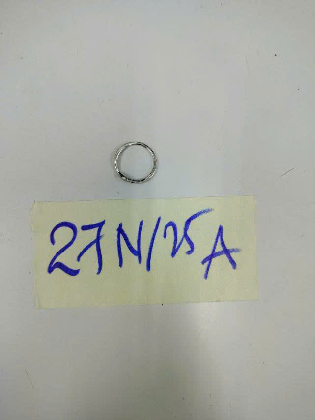 Ngày tiếp nhận: 04/01/2025 Mã hồ sơ: 27N2025A Mô tả: 01 nhẫn kim loại màu trắng bạc, mặt có đính năm hạt qua sử dụng. |