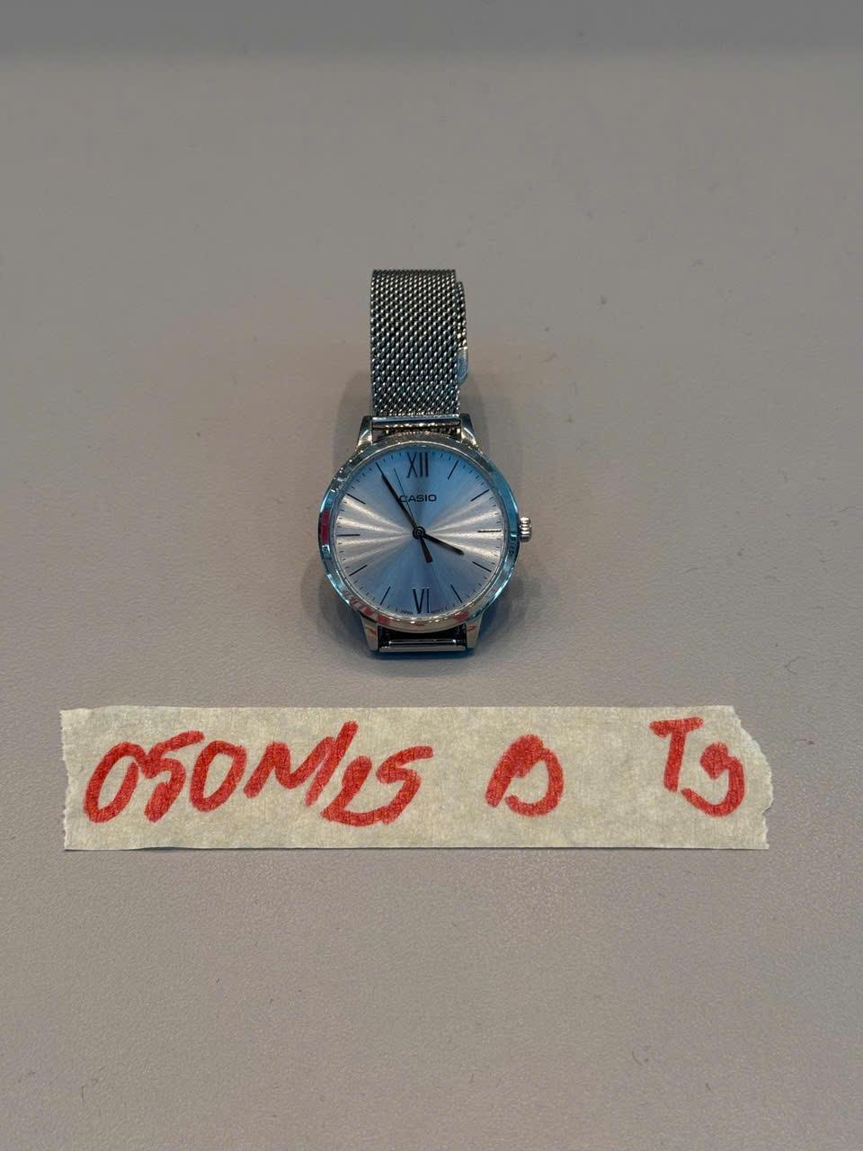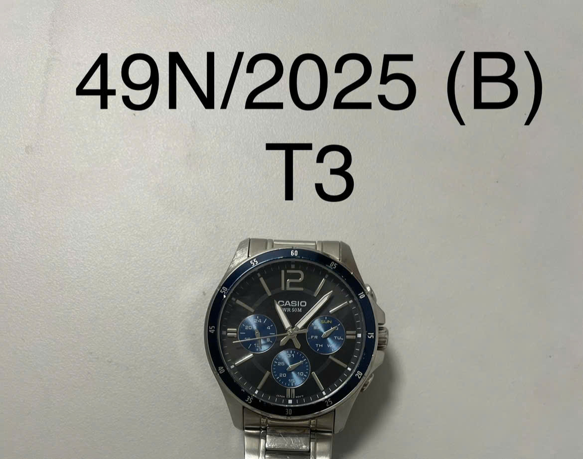 Ngày tiếp nhận: 04/10/2025 Mã hồ sơ: 49N2025B Mô tả: 01 đồng hồ dây kim loại màu bạc, mặt tròn nền đen, ghi chữ CASIO WR 50M, đã sử dụng. |
