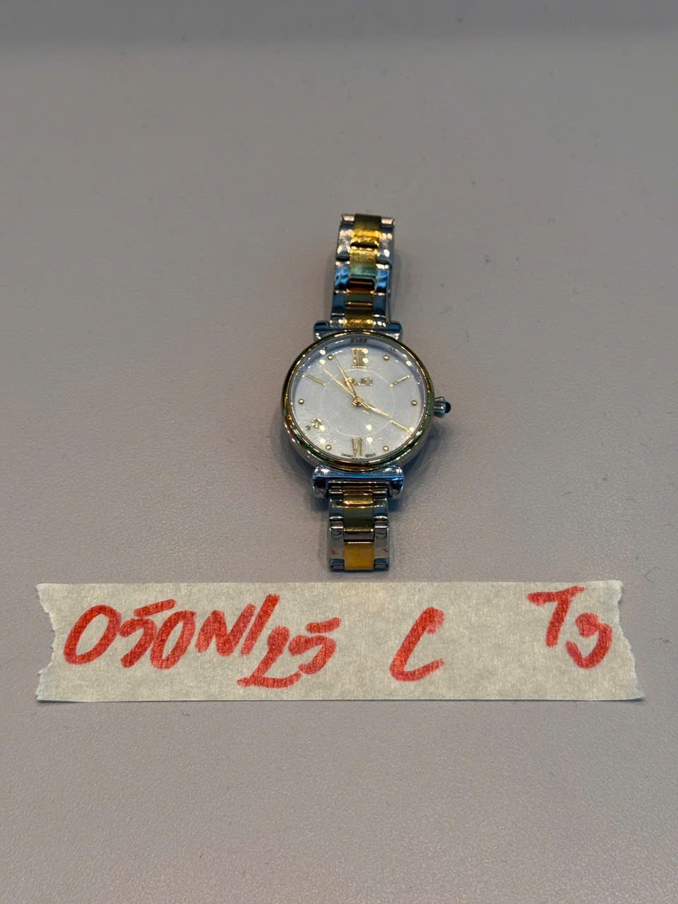 Ngày tiếp nhận: 05/10/2025 Mã hồ sơ: 50N2025C Mô tả: 01 đồng hồ mặt tròn màu trắng, viền vàng có chữ ELIO. |