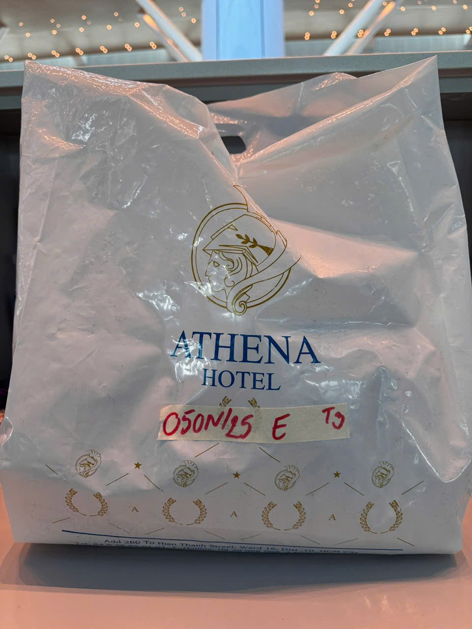 Ngày tiếp nhận: 05/10/2025 Mã hồ sơ: 50N2025E Mô tả: 01 túi trắng có chữ ATHENA HOTEL có 01 áo và 01 quần. |
