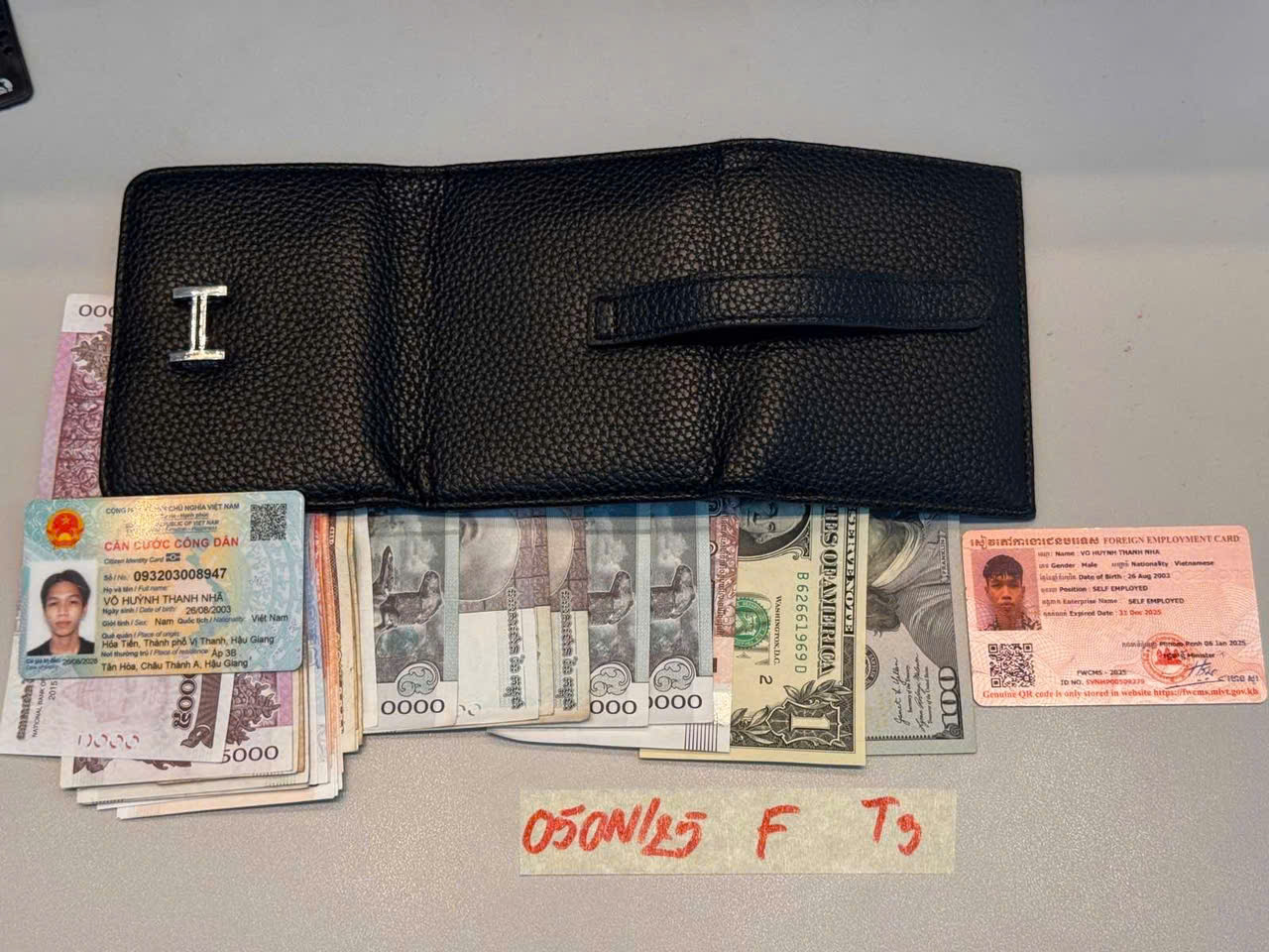 Ngày tiếp nhận: 05/10/2025 Mã hồ sơ: 50N2025F Mô tả: 01 bóp da màu đen bên trong có: 01 CCCD tên VÕ HUỲNH THANH NHÃ, 02 thẻ ngân hàng, giấy giống tiền Cambodia 20.000 - 01 tờ, 10000 - 06 tờ, 5000 - 02 tờ, 2000 - 03 tờ, 1000 - 05 tờ , 500 - 01 tờ, 100 - 06 tờ, giấy giống tiền USD: 100 - 01 tờ, giấy giống tiền VND: 10000 - 01 tờ. |