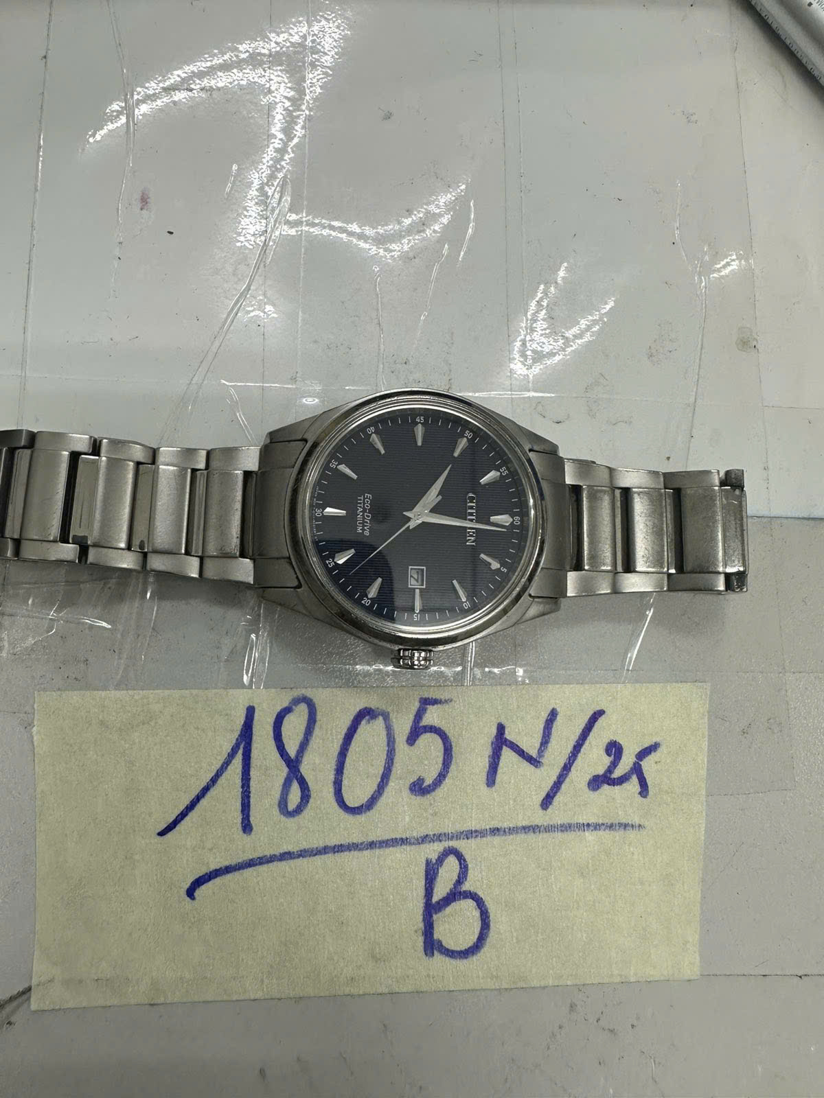 Ngày tiếp nhận: 06/10/2025 Mã hồ sơ: 1805N2025B Mô tả: 01 đồng hồ dây kim loại xám, mặt đen. Có chữ CITIZEN. |