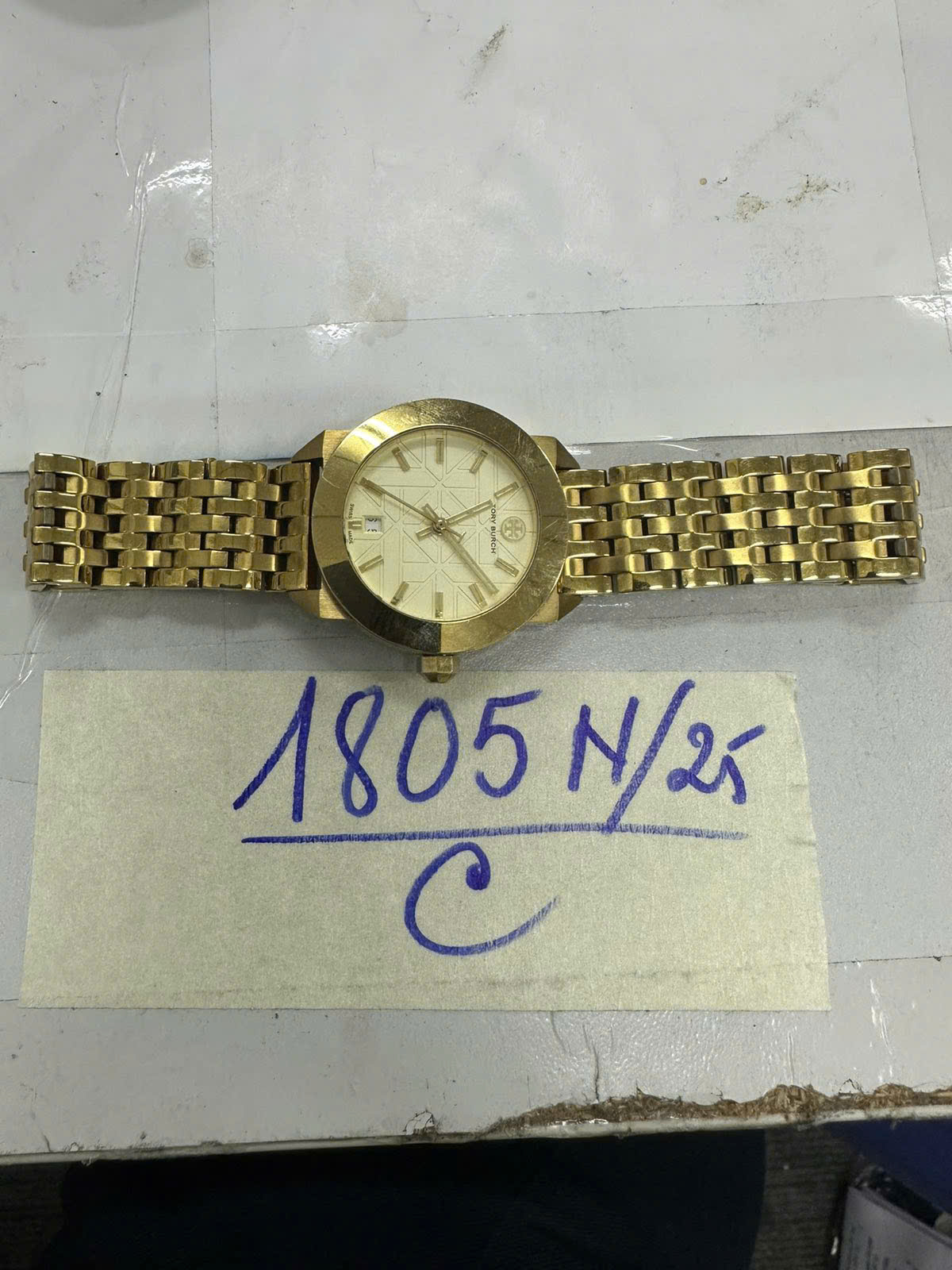 Ngày tiếp nhận: 06/10/2025 Mã hồ sơ: 1805N2025C Mô tả: 01 đồng hồ dây kim loại màu vàng, mặt màu vàng. Hiệu TORY BURCH. |
