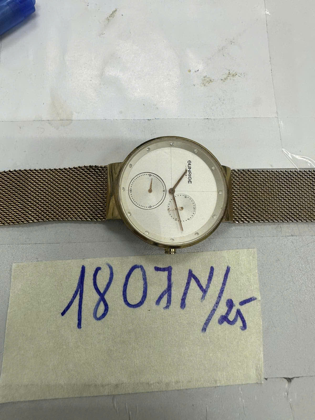 Ngày tiếp nhận: 06/10/2025 Mã hồ sơ: 1807N2025 Mô tả: 01 đồng hồ mặt tròn dây kim loại màu vàng có chữ SUNRISE. |