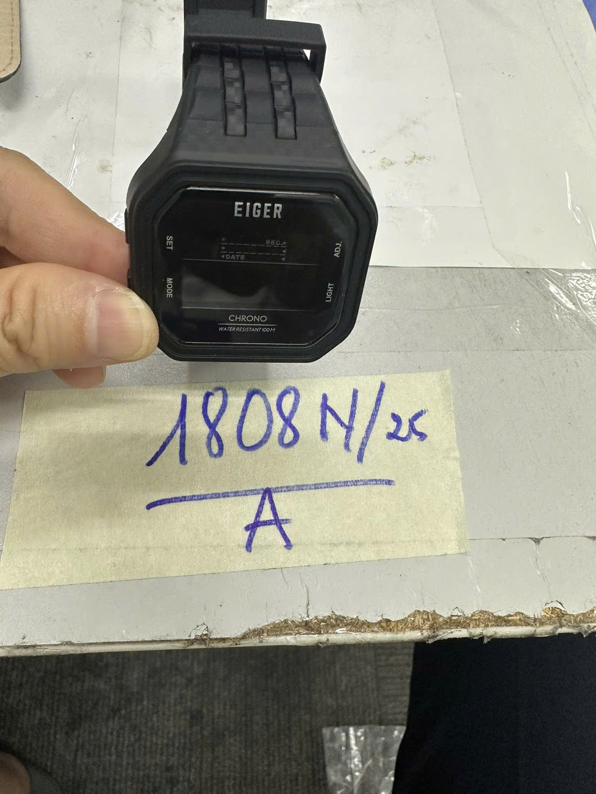 Ngày tiếp nhận: 06/10/2025 Mã hồ sơ: 1808N2025A Mô tả: 01 đồng hồ mặt vuông bằng cao su màu đen có chữ EIGER 1989 CHRONO. |