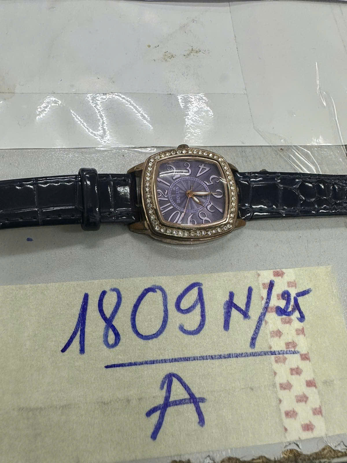 Ngày tiếp nhận: 06/10/2025 Mã hồ sơ: 1809N2025A Mô tả: 01 đồng hồ bằng kim loại, mặt chữ nhật màu vàng có đính đá chữ BOLUN. |
