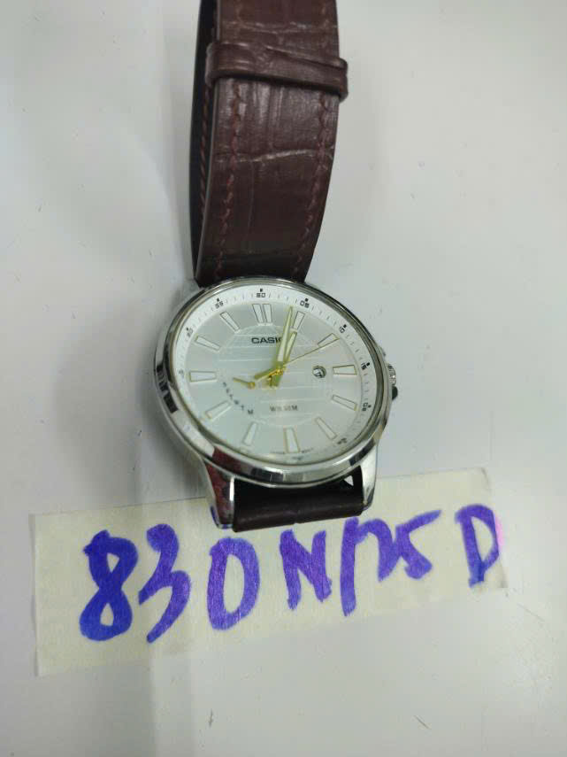 Ngày tiếp nhận: 04/5/2025 Mã hồ sơ: 830N2025D Mô tả: 01 đồng hồ Casio mặt trắng, dây da màu nâu. |