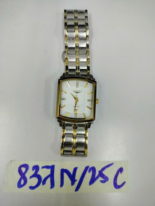 Ngày tiếp nhận: 06/5/2025 Mã hồ sơ: 837N2025C Mô tả: 01 đồng hồ có logo chữ LONGINESS SHAPHIRE màu bạc viền vàng, dây kim loại màu bạc. |
