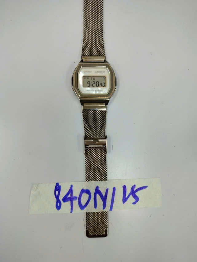 Ngày tiếp nhận: 06/5/2025 Mã hồ sơ: 840N2025 Mô tả: 01 đồng hồ màu hồng có chữ CASIO, dây kim loại màu đồng. |
