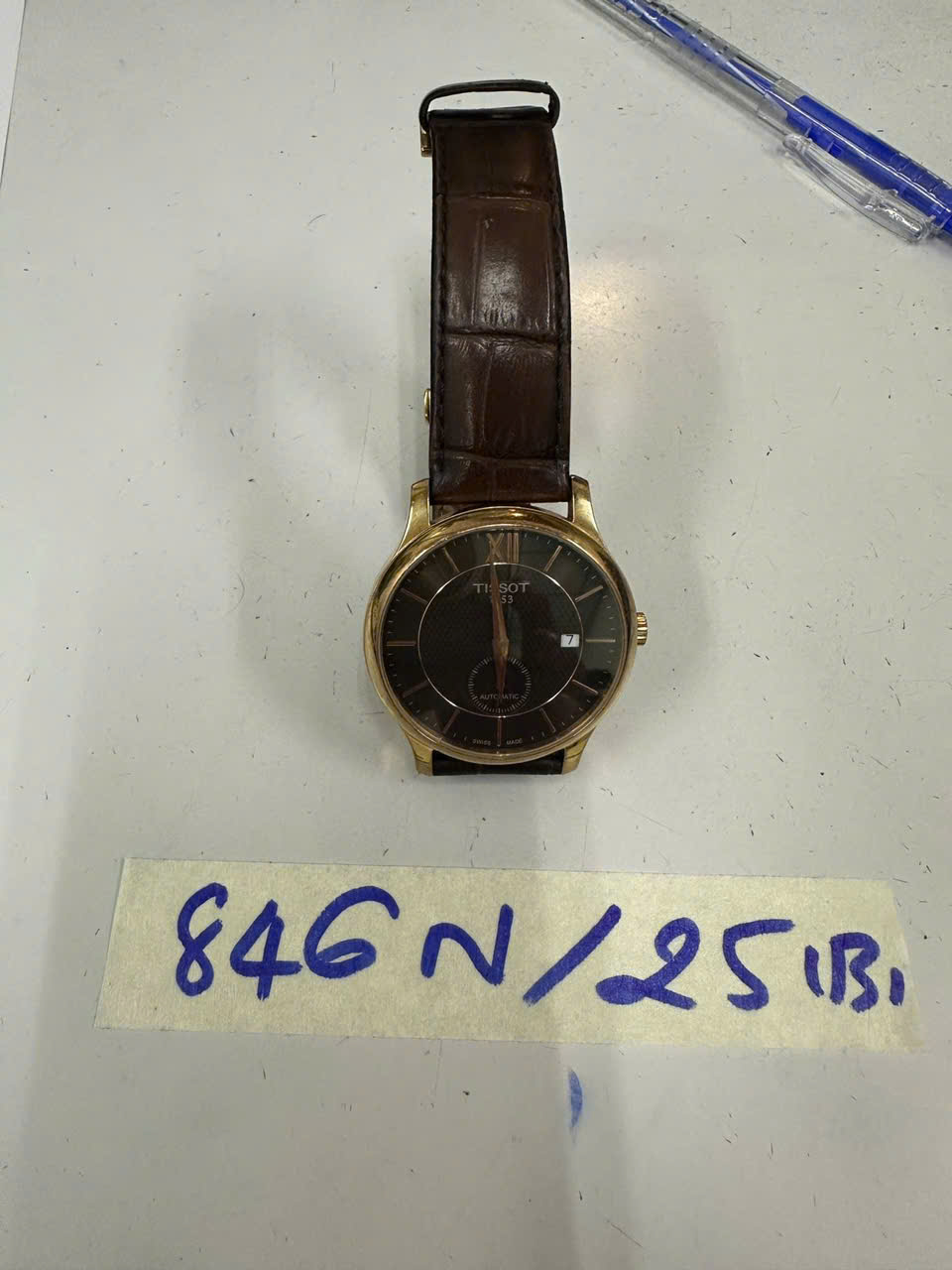 Ngày tiếp nhận: 06/5/2025 Mã hồ sơ: 846N2025B Mô tả: 01 đồng hồ dây da màu nâu có chữ TISSOT. |
