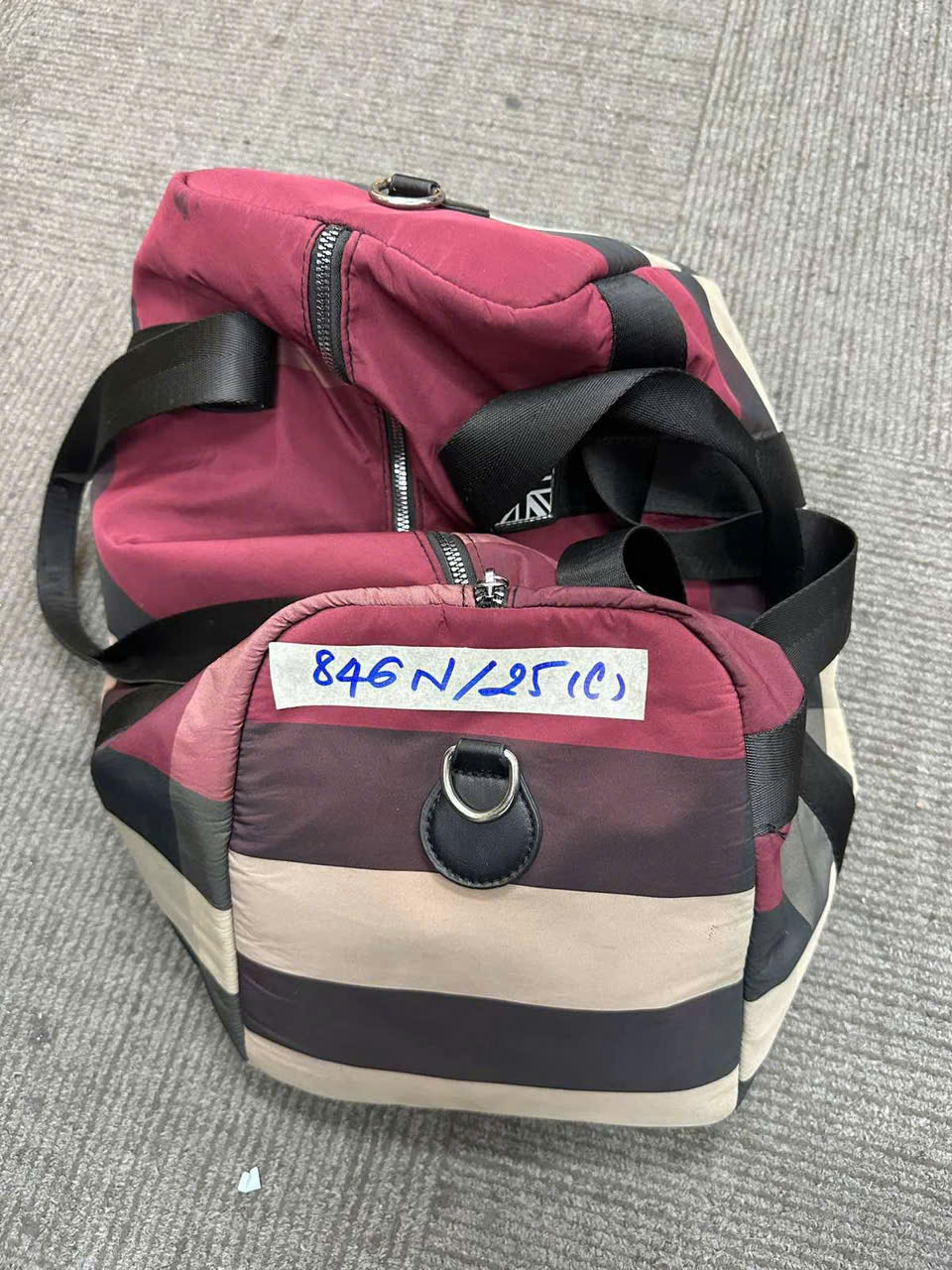 Ngày tiếp nhận: 06/5/2025 Mã hồ sơ: 846N2025C Mô tả: 01 túi ca rô màu đỏ sọc kem bên trong có 01 áo khoác jean xanh. |